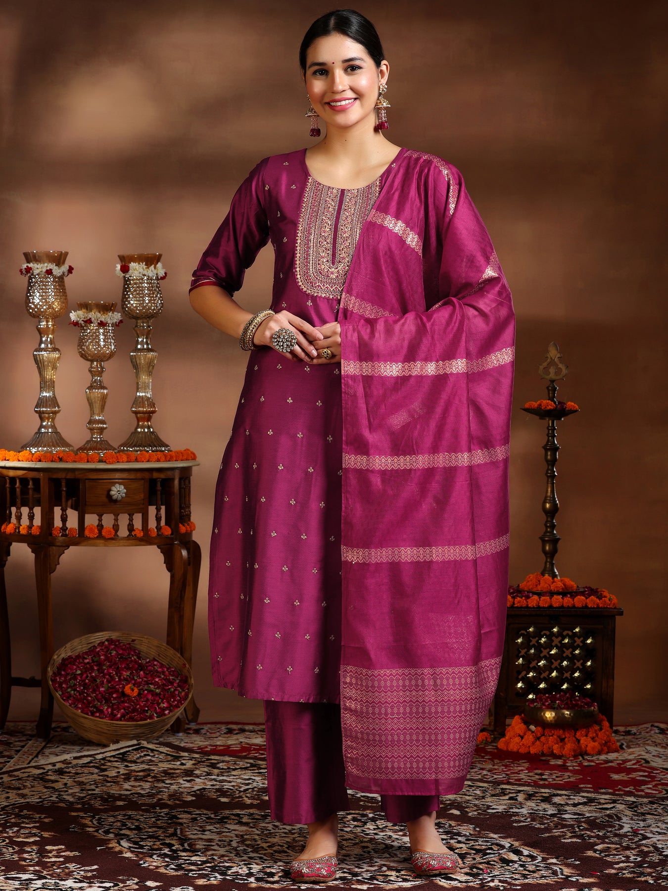 Our 3-piece pink embroidered silk blend suit set features a straight kurta with a round neckline, three-quarter sleeves, and a statement yoke. Complemented with trousers with a partially elasticated waistband and roomy pockets, and a dupatta. Highlighted with intricate thread work, Gota Patti detailing, and sequins, this charming style is perfect for festive celebrations.