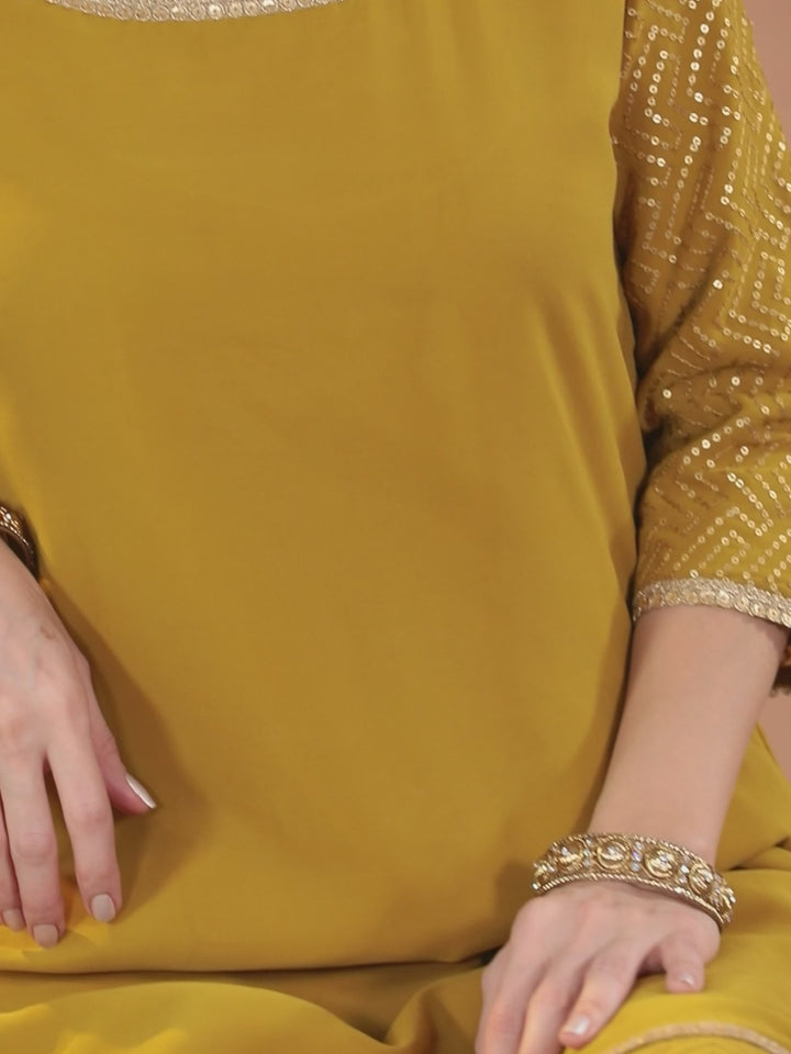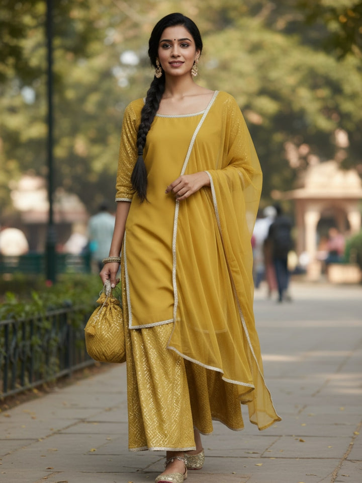 Mustard Solid Georgette Straight Kurta With Palazzos & Dupatta
