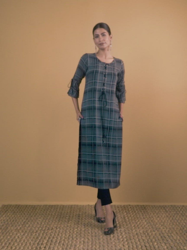 Effortless style and comfort is what you get with this stunning olive green kurta. This straight kurta is featuring checked pattern all over, lace tie-up detail at neck and bell sleeves, straight hem and side slits. Pair it with black palazzos/leggings and heels to complete the look.