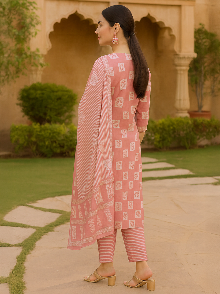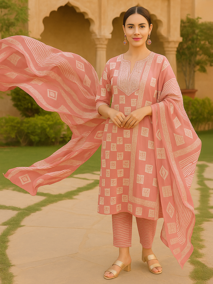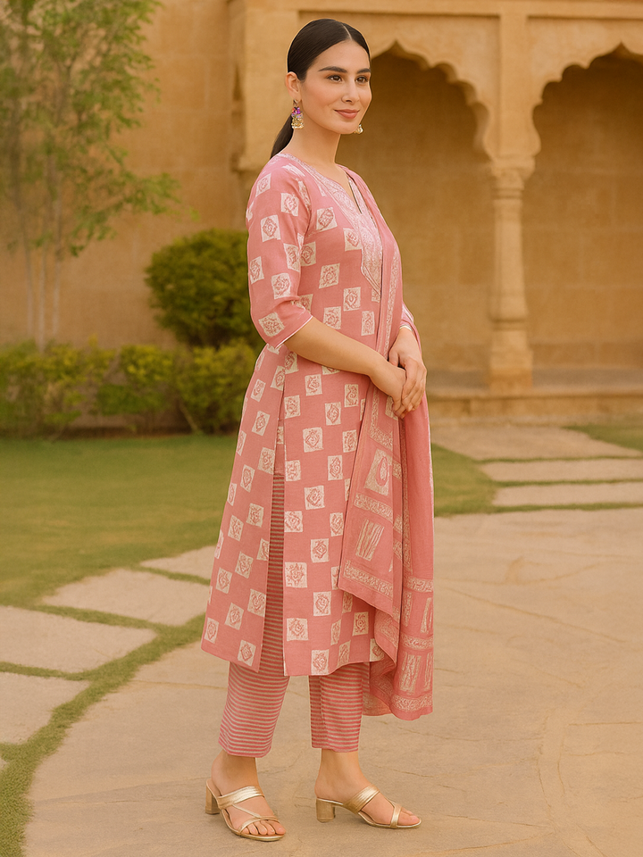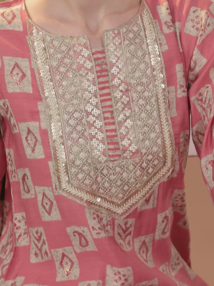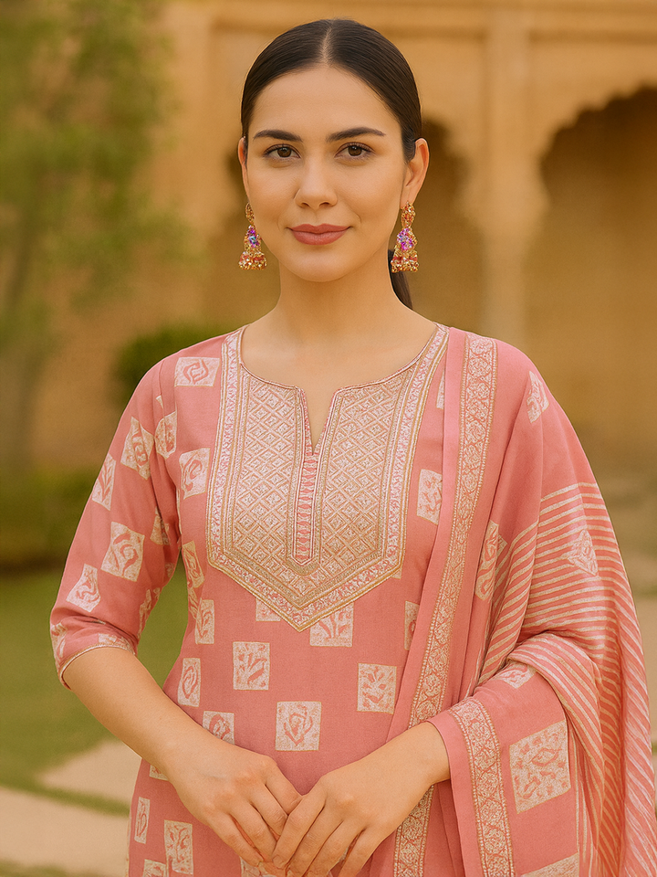 Peach Yoke Design Silk Blend Straight Kurta With Trousers & Dupatta