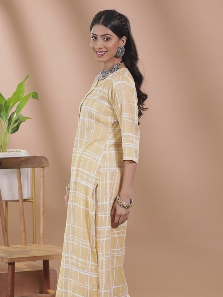 Our yellow straight-fit kurta, crafted in soft rayon fabric features a round neckline with handmade fabric buttons, checked print and three-quarter sleeves. This chic style is ideal for a casual day out.