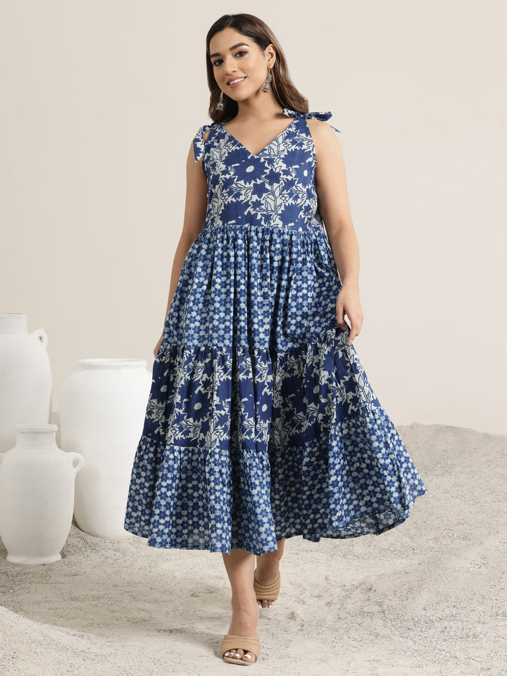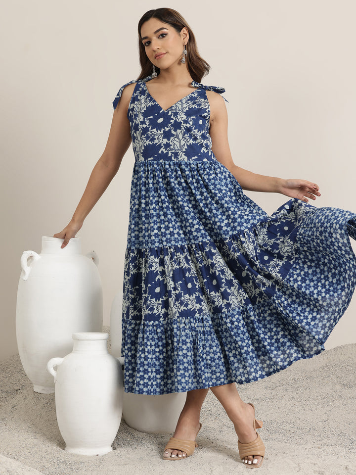 Our indigo printed cotton fit and flare one piece dress features a V-neckline with tie-up sleeves. Highlighted with captivating floral prints, this style is perfect for casual outings.