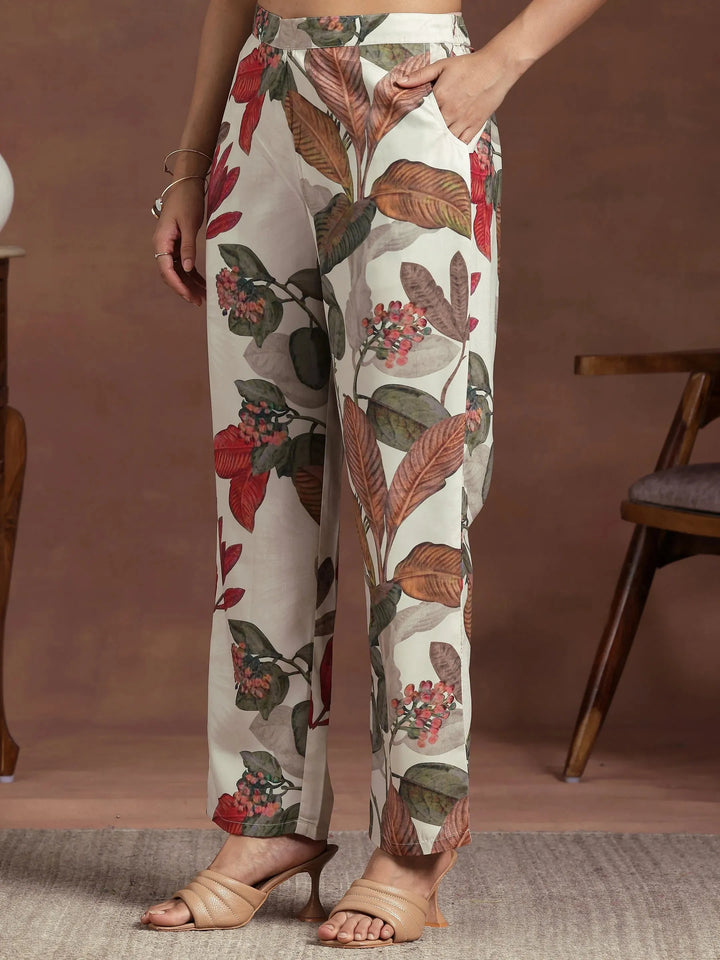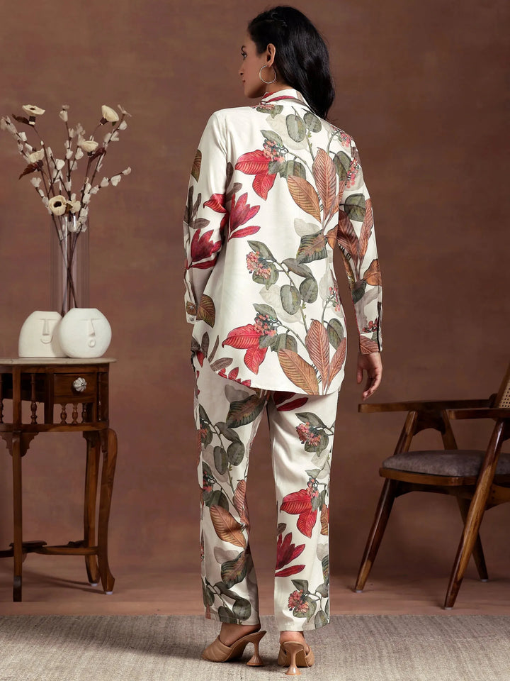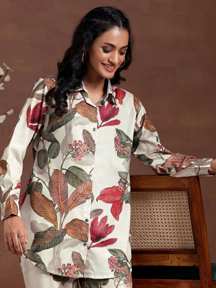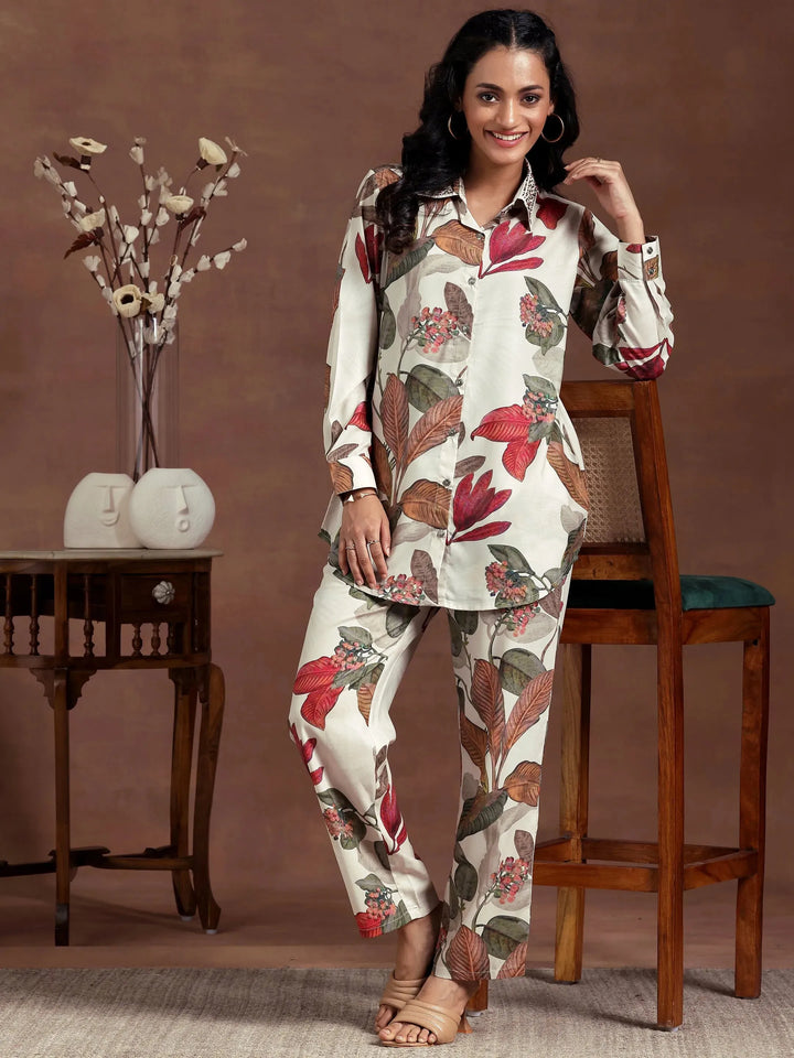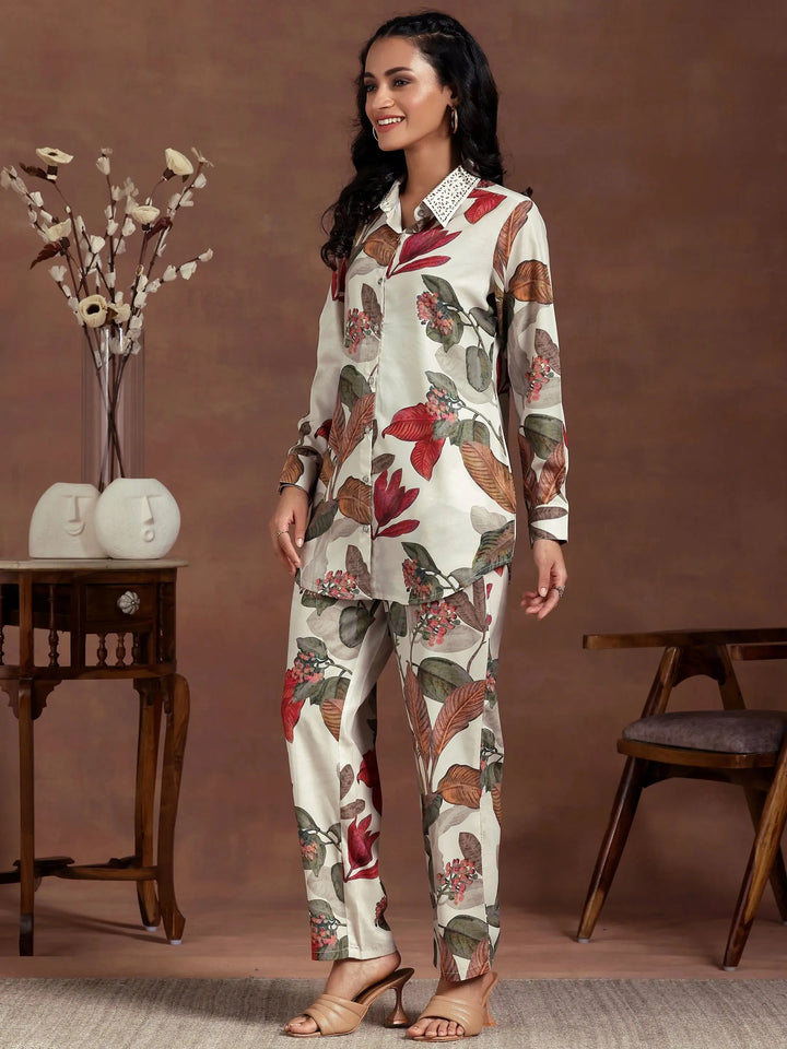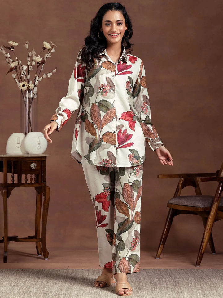Our 2-piece beige printed polyester co-ord set features a shirt collar buttoned-down curved kurta with comfortable full sleeves. Complemented with matching trousers with a partially elasticated waistband and roomy pockets. Adorned with beaded accents and stylish buttons, this elegant style is an ideal choice for casual outings.