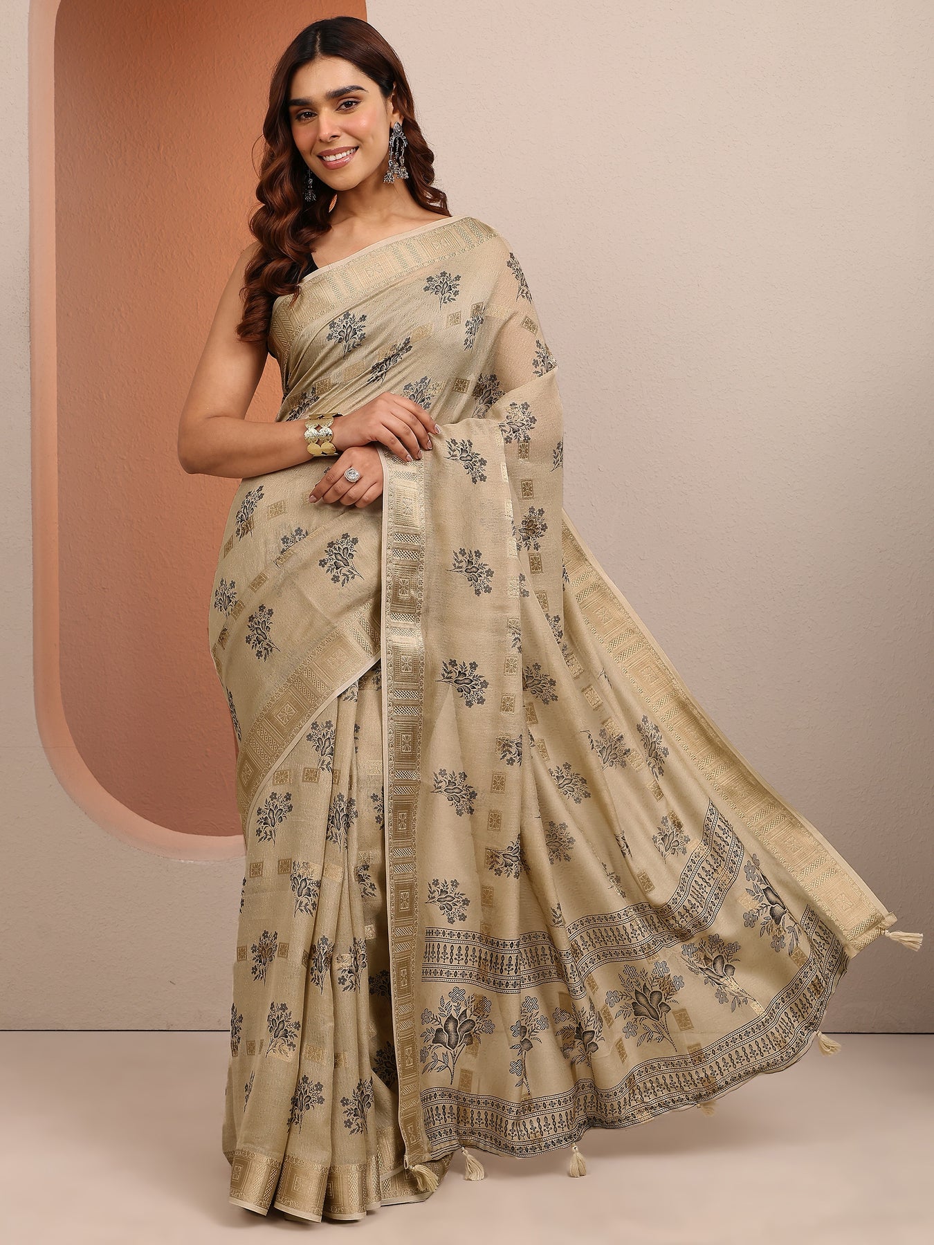 Beige Printed Silk Blend Saree With Unstitched Blouse Piece