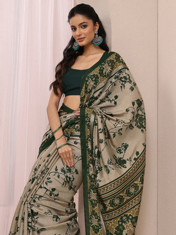 Beige Printed Silk Blend Saree With Unstitched Blouse Piece