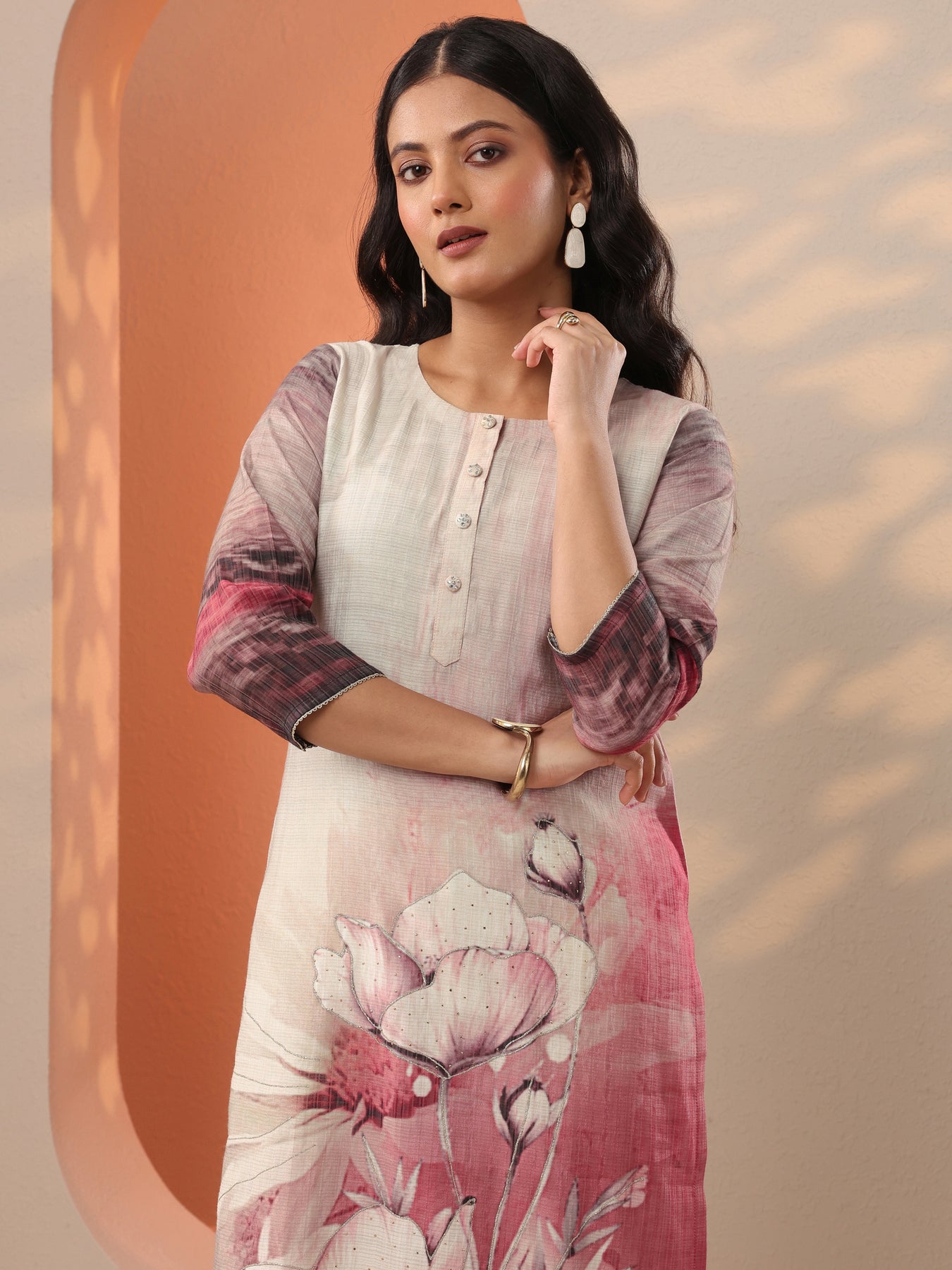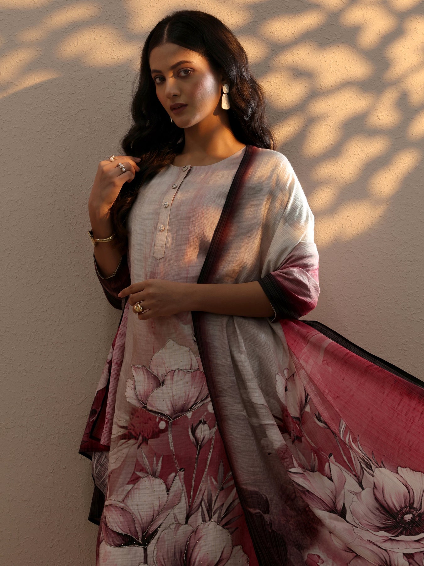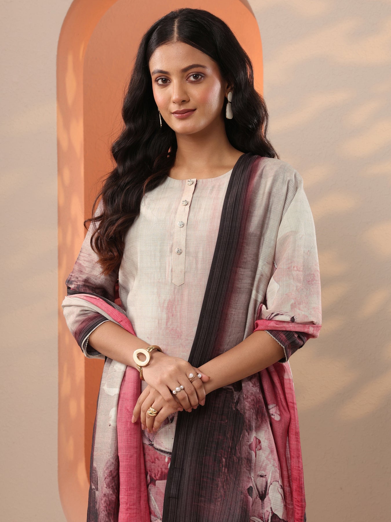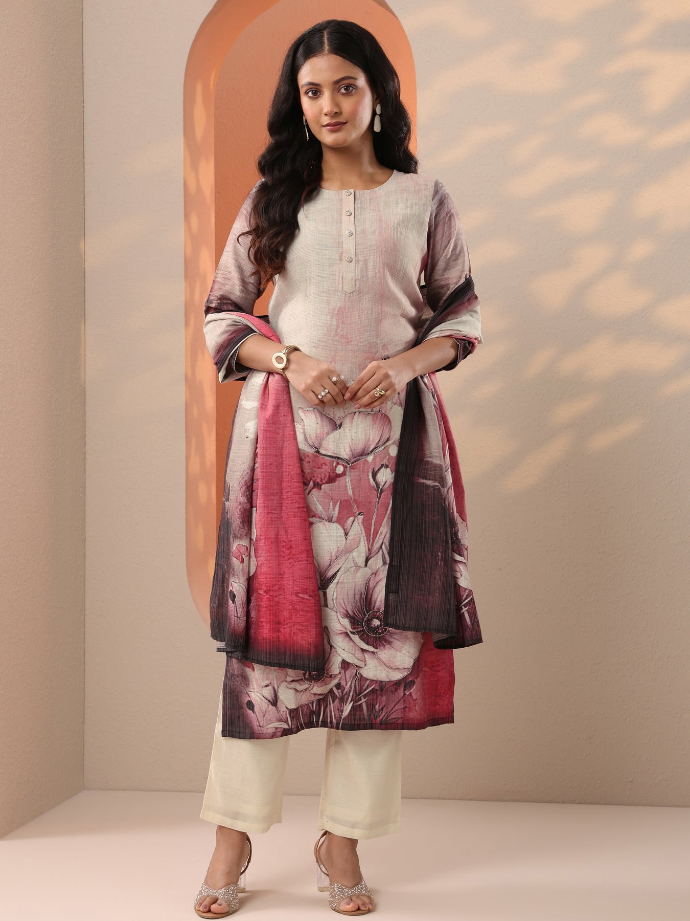 Beige Printed Silk Blend Straight Suit Set With Dupatta