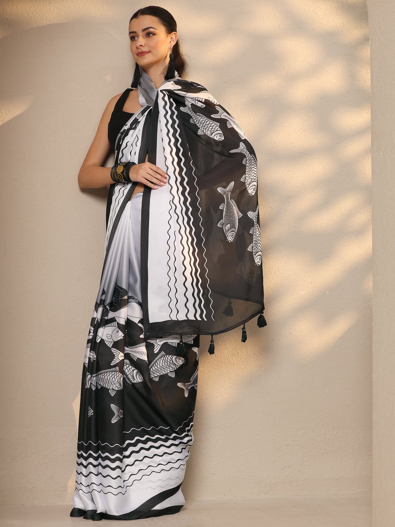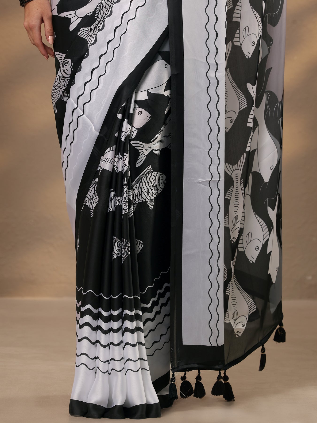 Black Animal Printed Satin Saree With Unstitched Blouse Piece