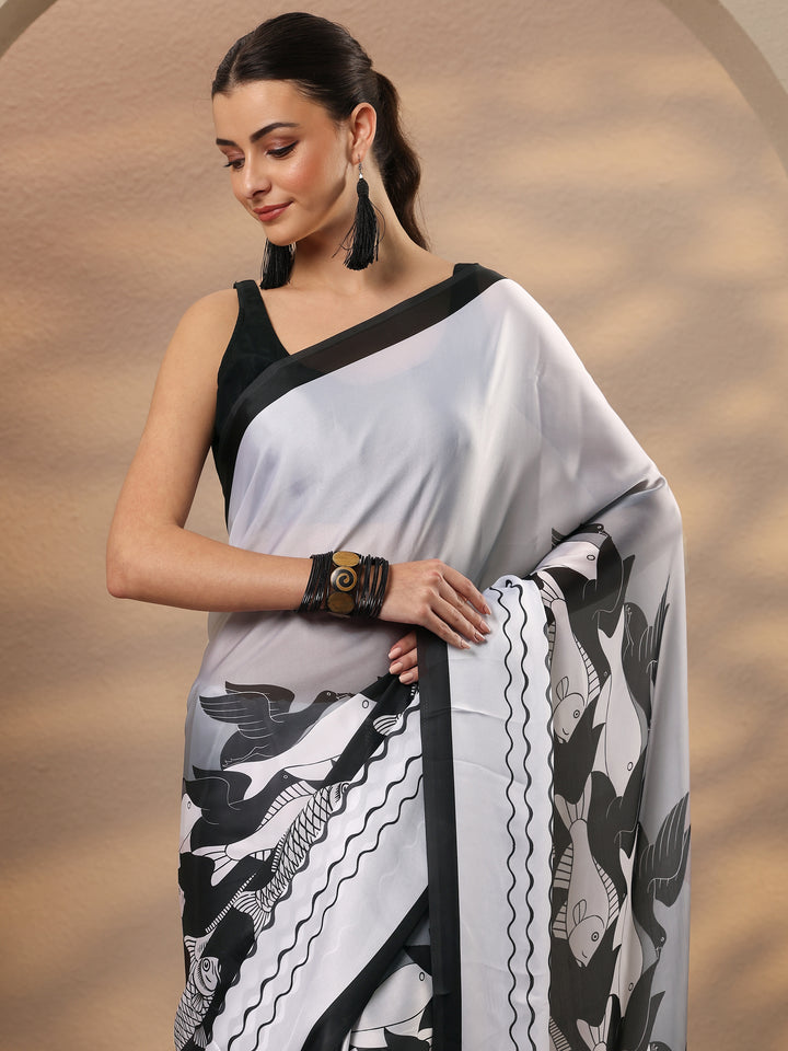 Our Black Printed Satin Saree Features Captivating Animal. Complemented With An Unstitched Blouse Piece. This Charming Saree Is Perfect For Festive Occasions.