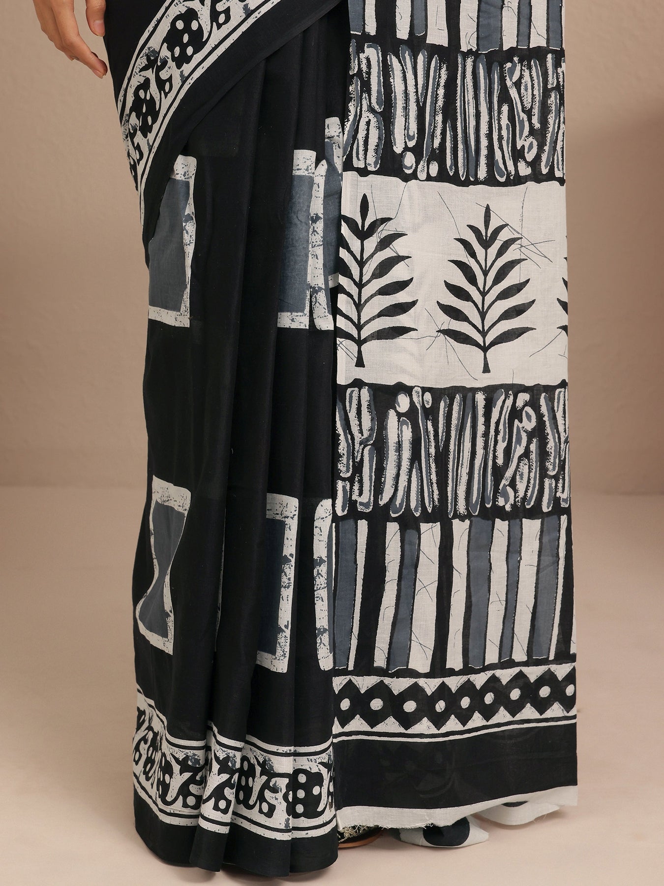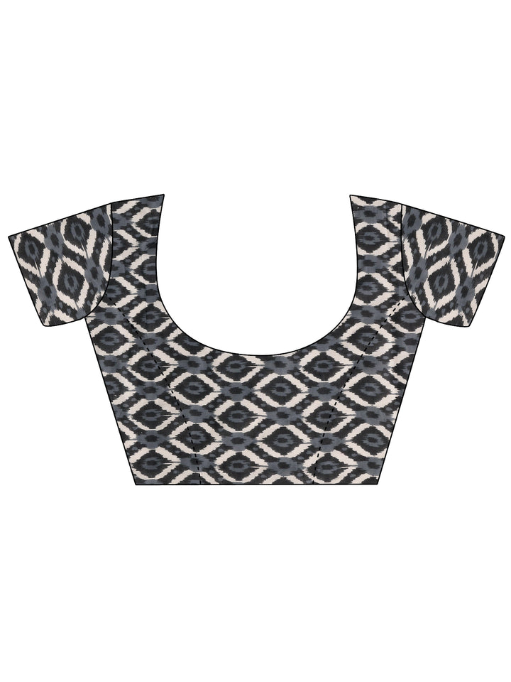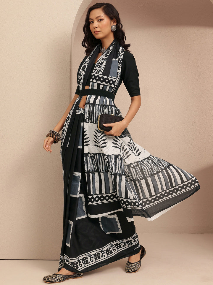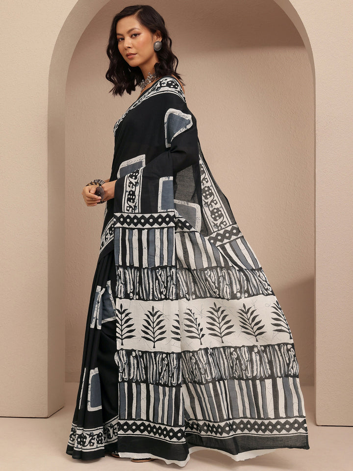 Black Block Printed Cotton Saree With Unstitched Blouse Piece