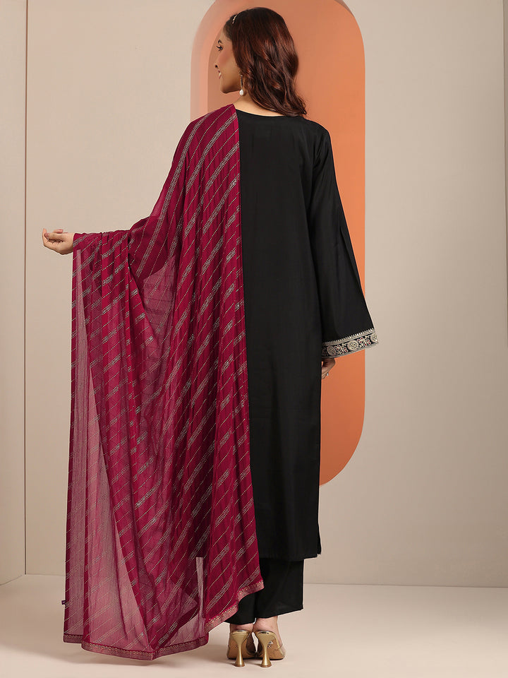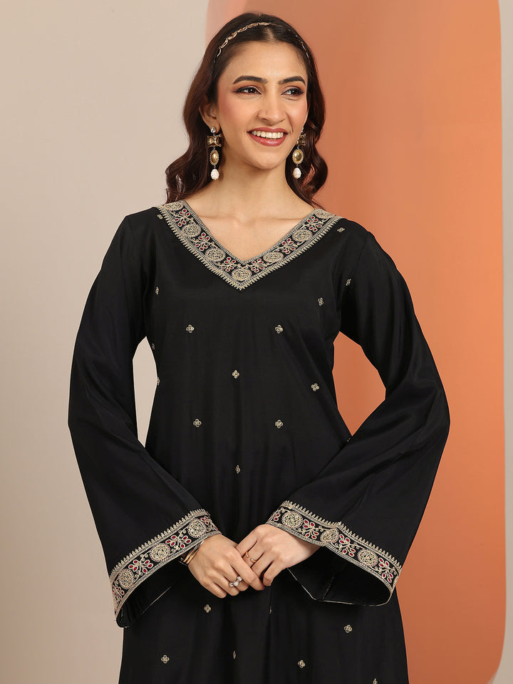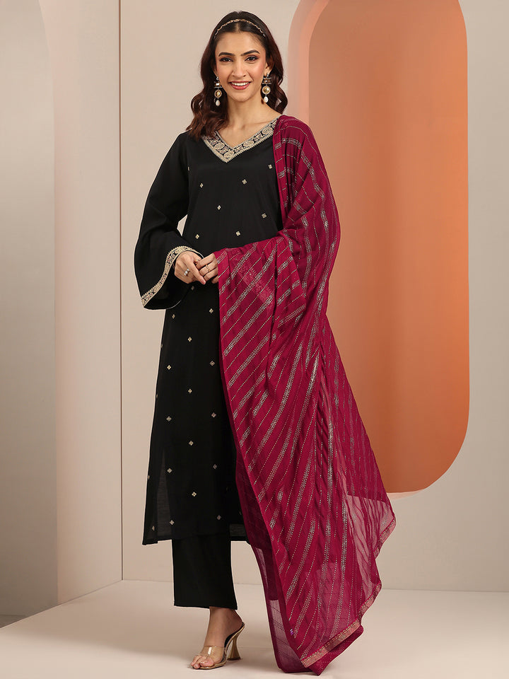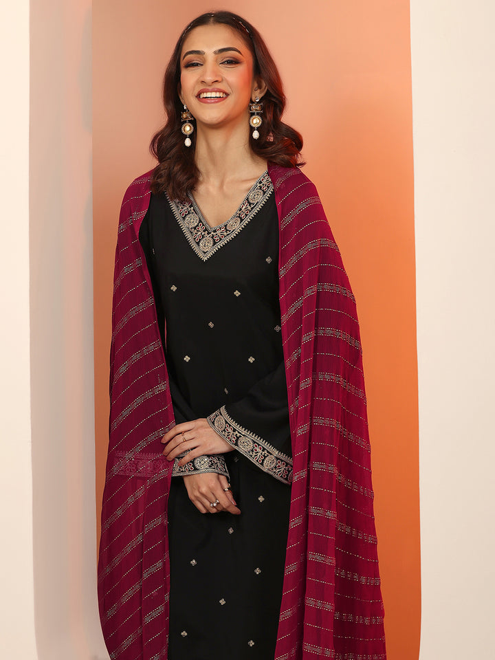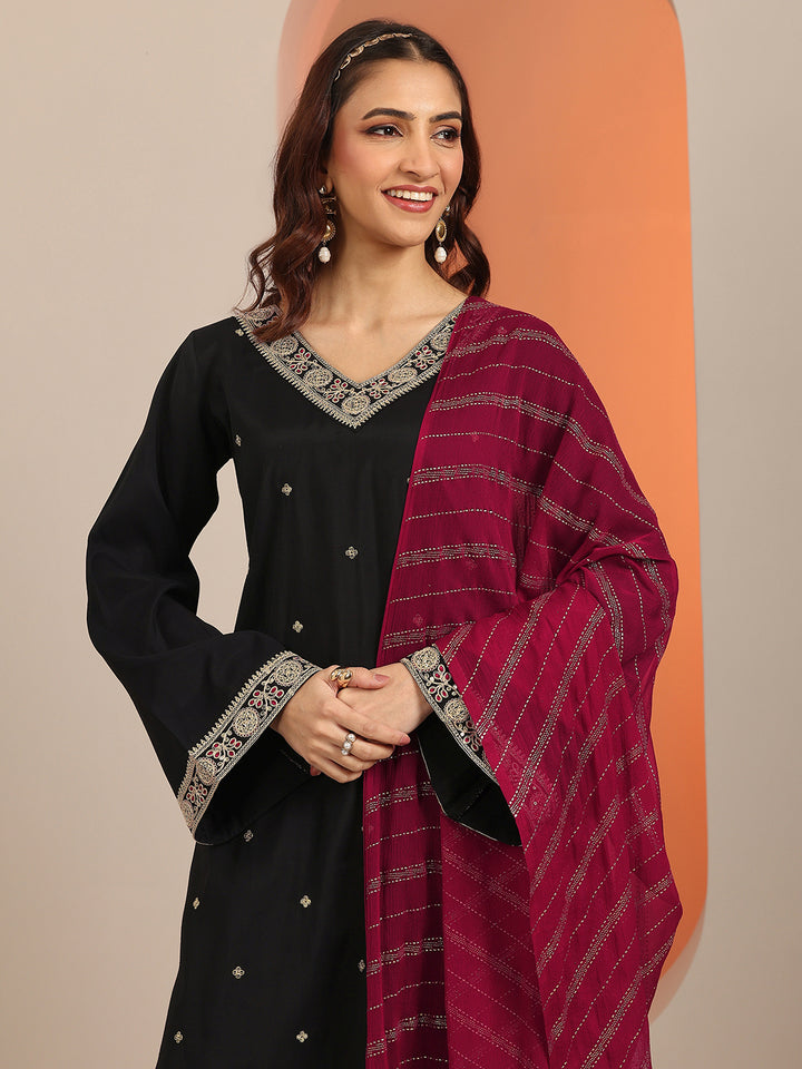 Black Embellished Silk Blend Straight Suit Set With Dupatta
