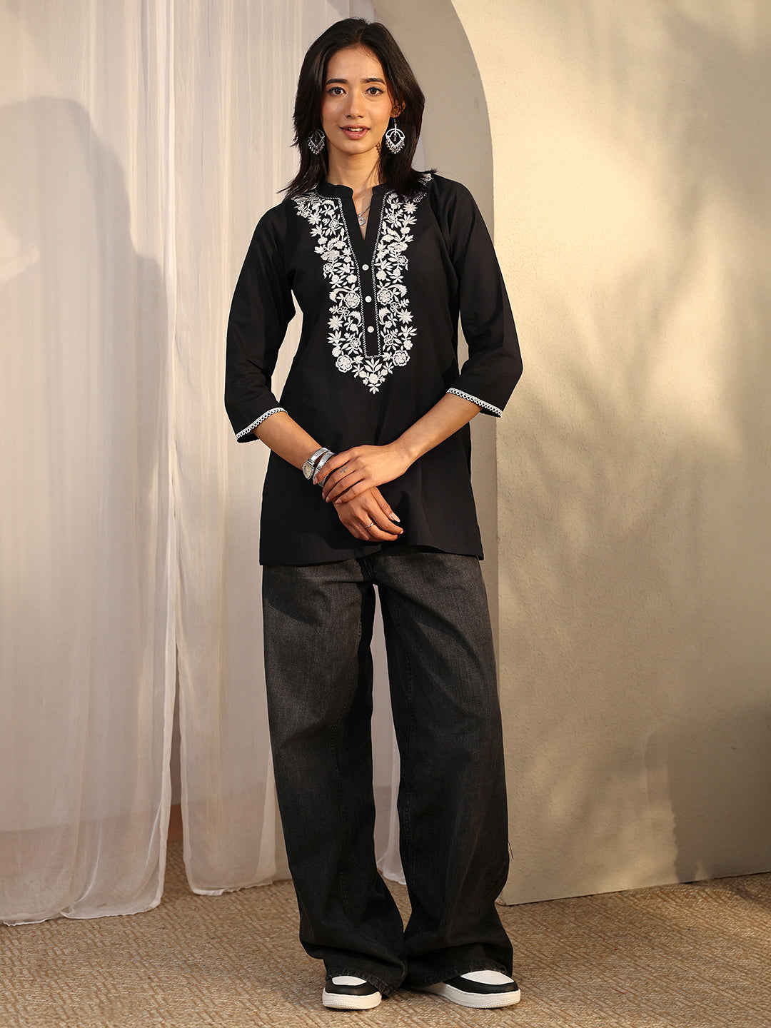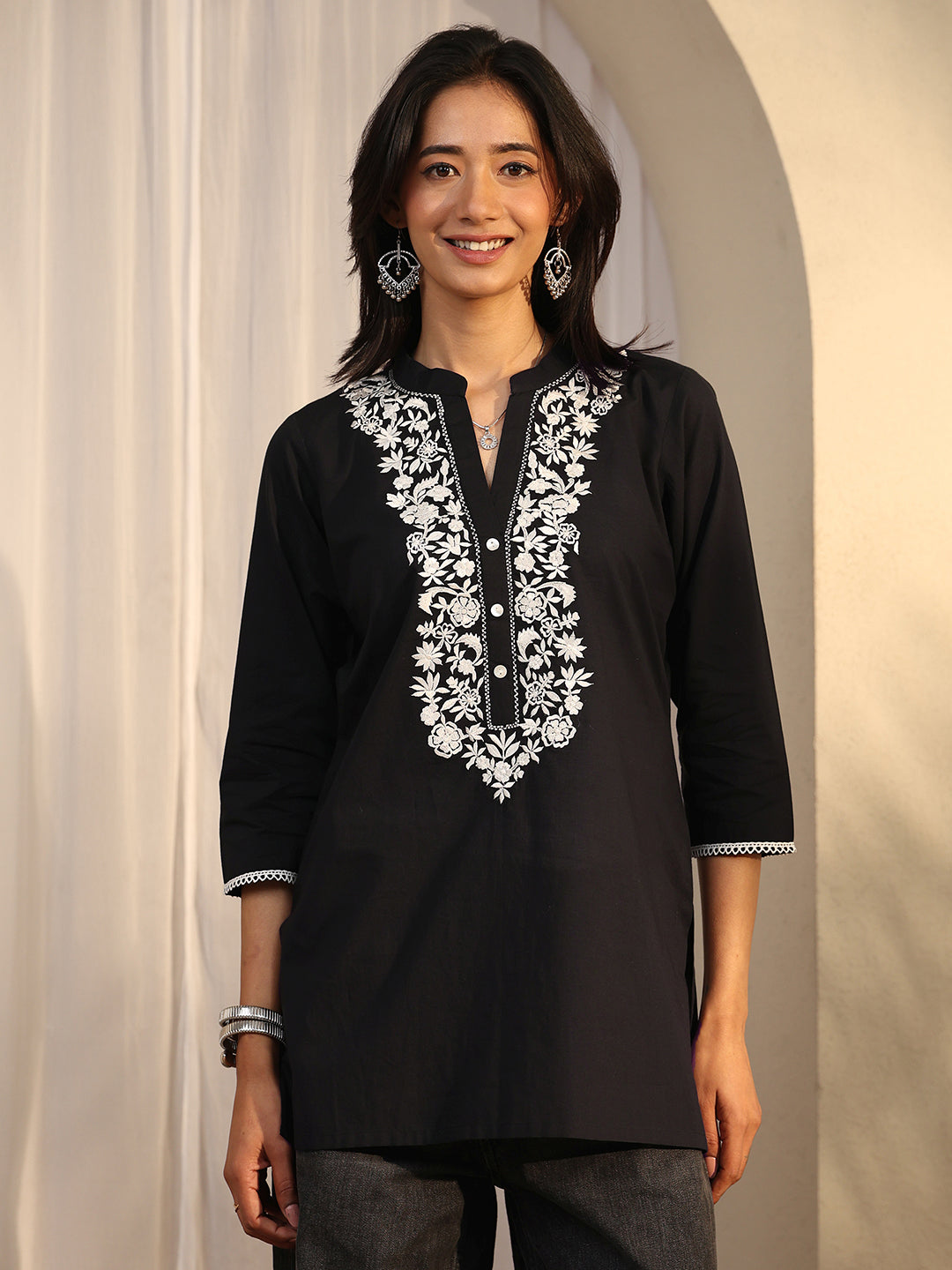 Our 1-piece black cotton straight-fit kurta features a mandarin collar neckline, regular sleeves, and statement yoke. Adorned with floral embroidered, this style is perfect for work wear and casual wear.