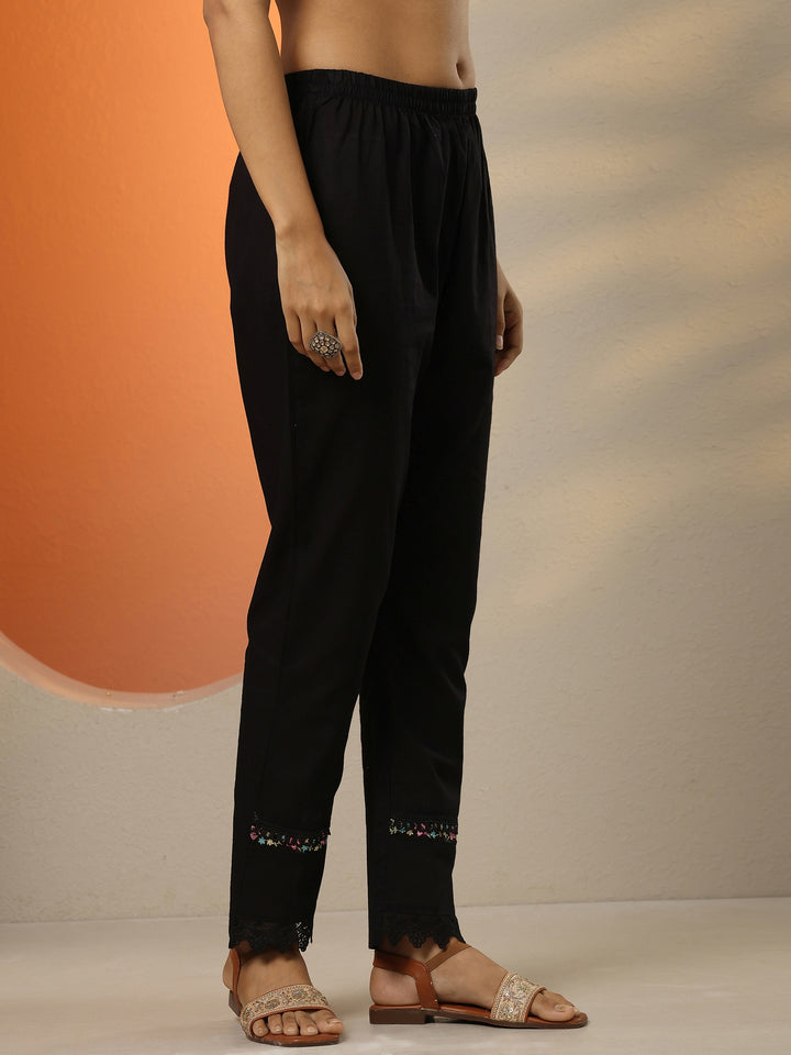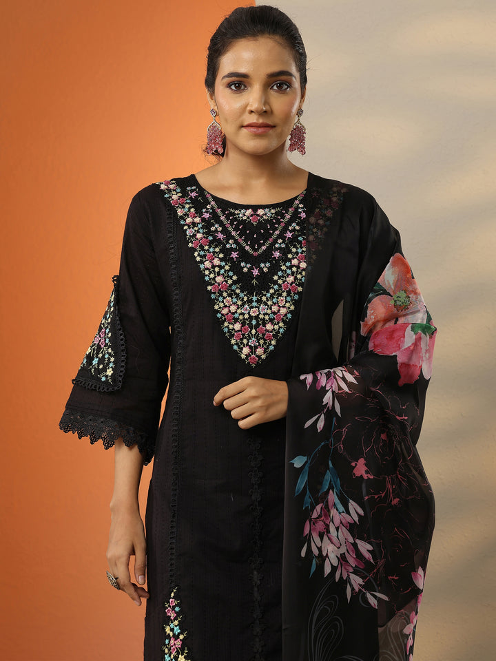 Black Embroidered Cotton Straight Suit Set With Dupatta