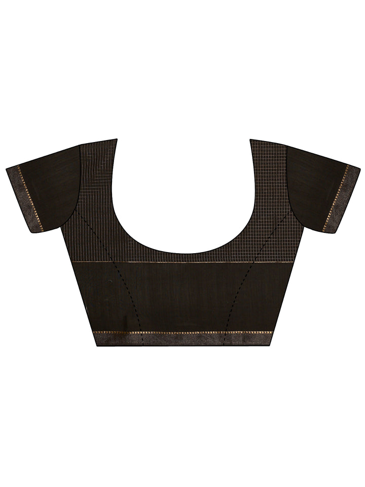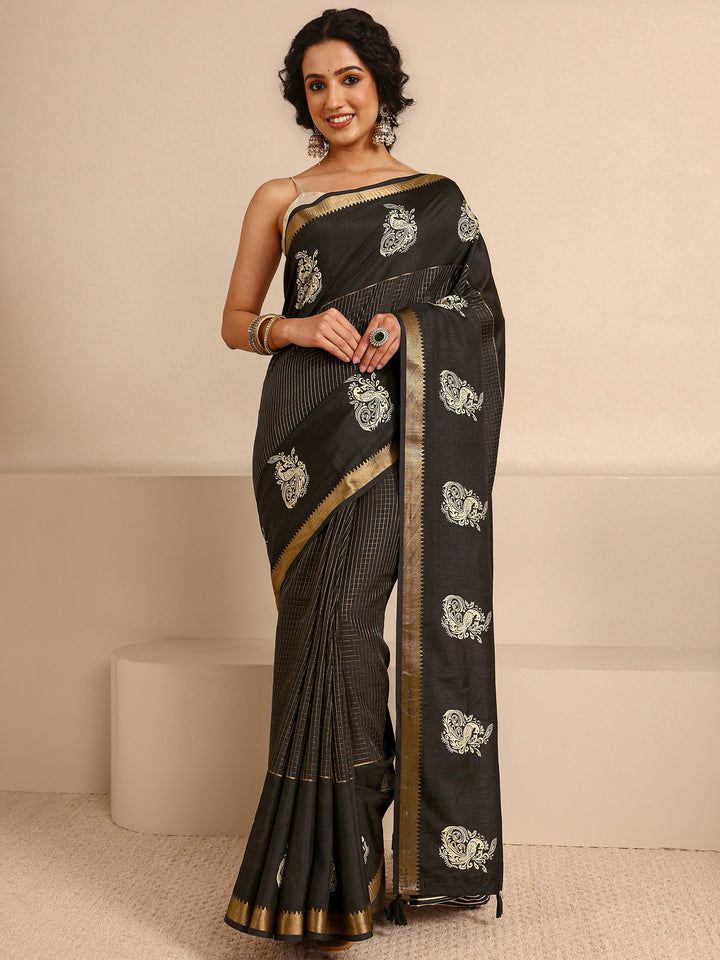 Our black silk-blend saree features a rich, textured finish adorned with elegant gold zari woven motifs and a traditional paisley-patterned border. Complemented with a unstitched blouse, this graceful saree is perfect for festive occasions and traditional celebrations.