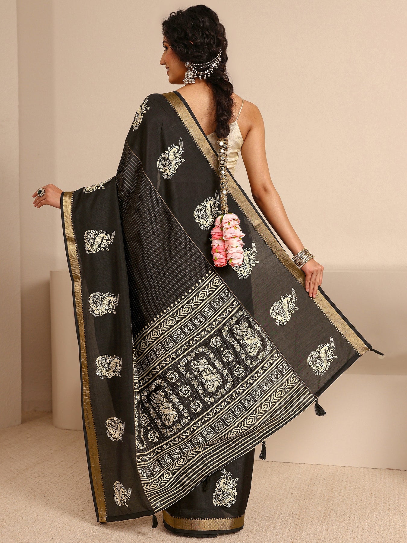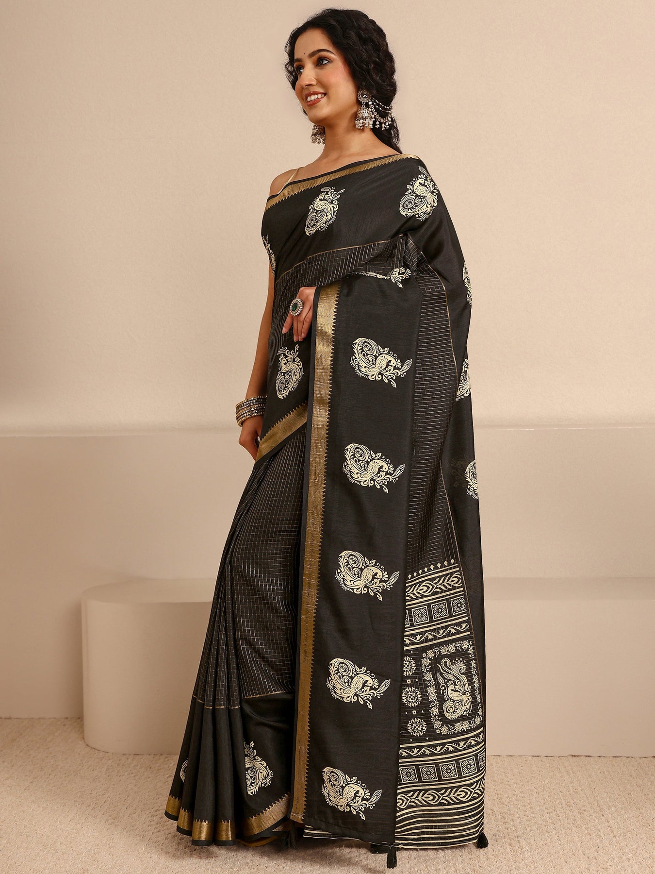 Black Ethnic Motifs Print Silk Blend Saree With Unstitched Blouse Piece