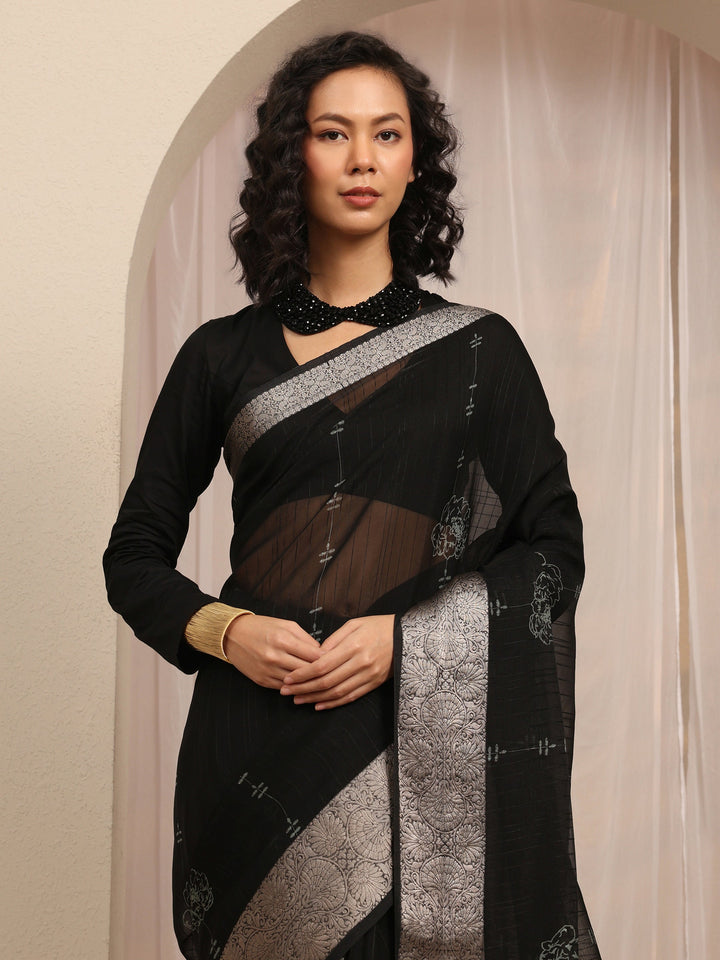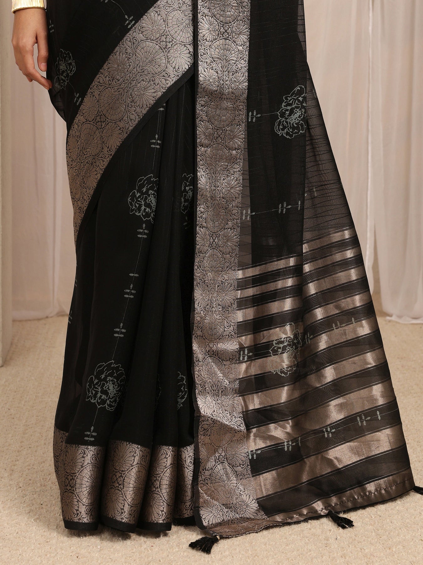 Black Floral Woven Design Silk Blend Saree With Unstitched Blouse Piece