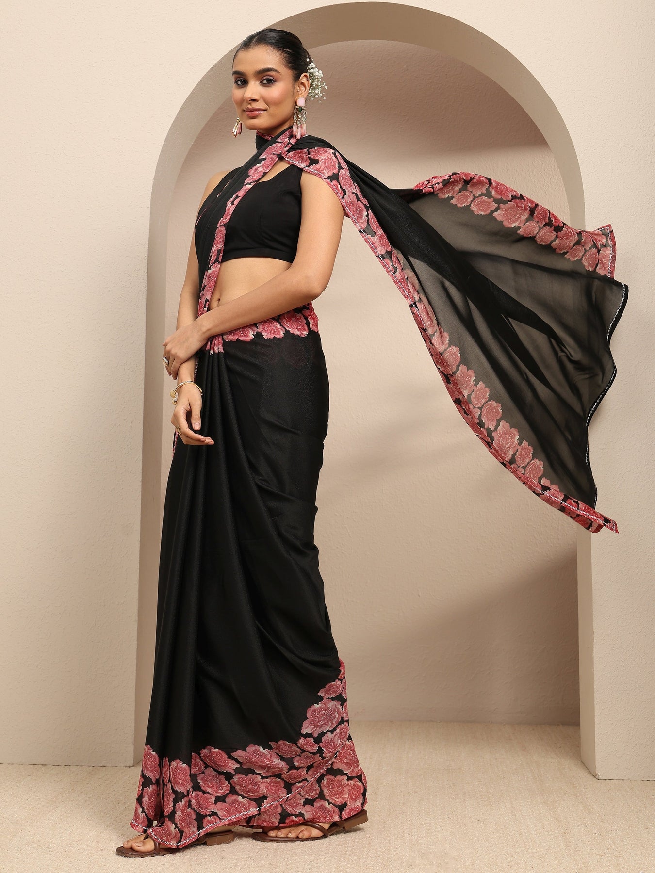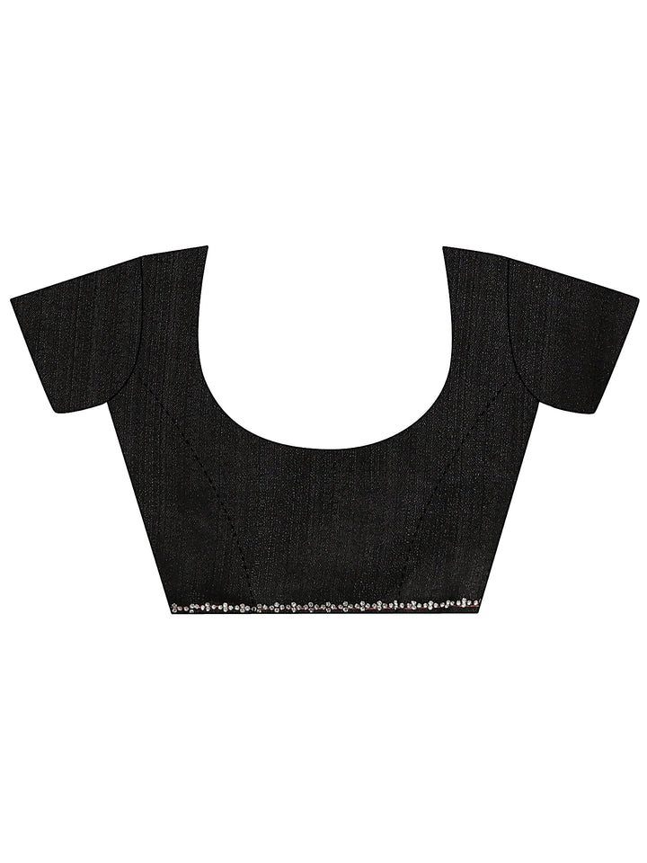 Our black silk blend saree features a captivating floral design. Complemented with a blouse piece. This charming saree is perfect for festive occasions.