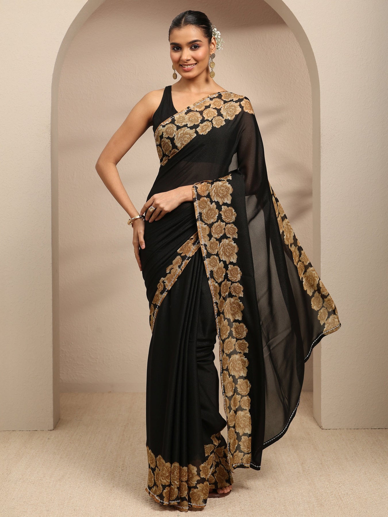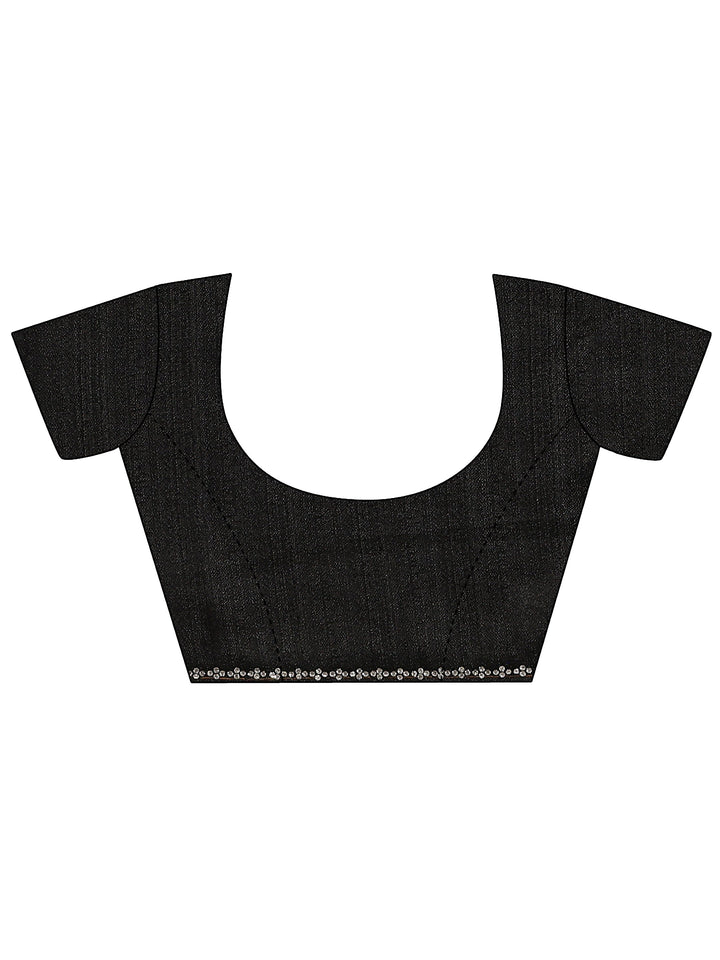 Our black silk blend saree features a captivating floral design. Complemented with a blouse piece. This charming saree is perfect for festive occasions.