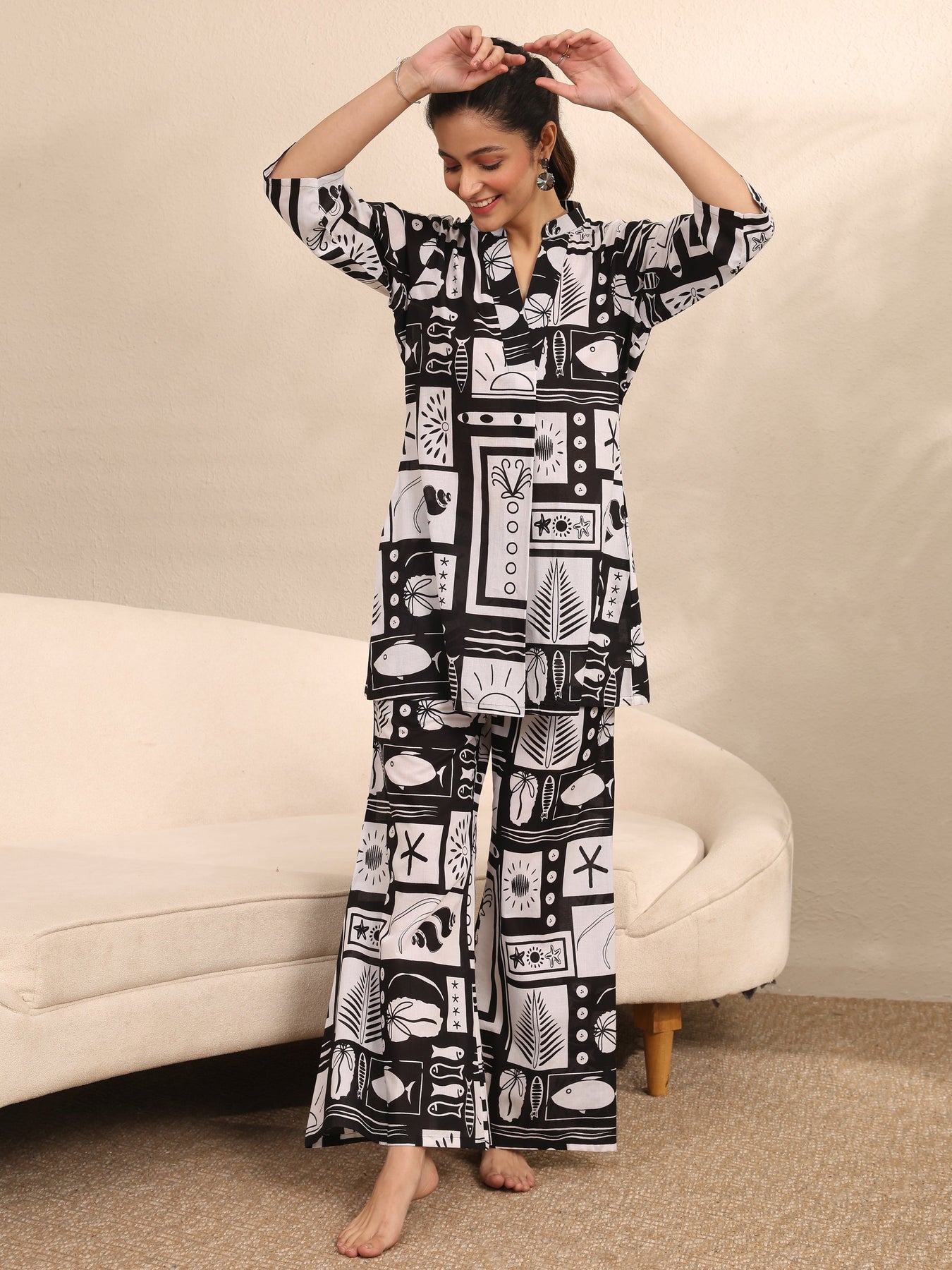 Our 2-piece Black printed Cotton nightsuit features a Straight-fit Shirt with a V-Neck neckline and Three-quarter sleeves. Complemented with matching Pyjamas with Partially Elasticated waistband and 2 pockets. Elevated with Top Print, this style is perfect for Night Wear.