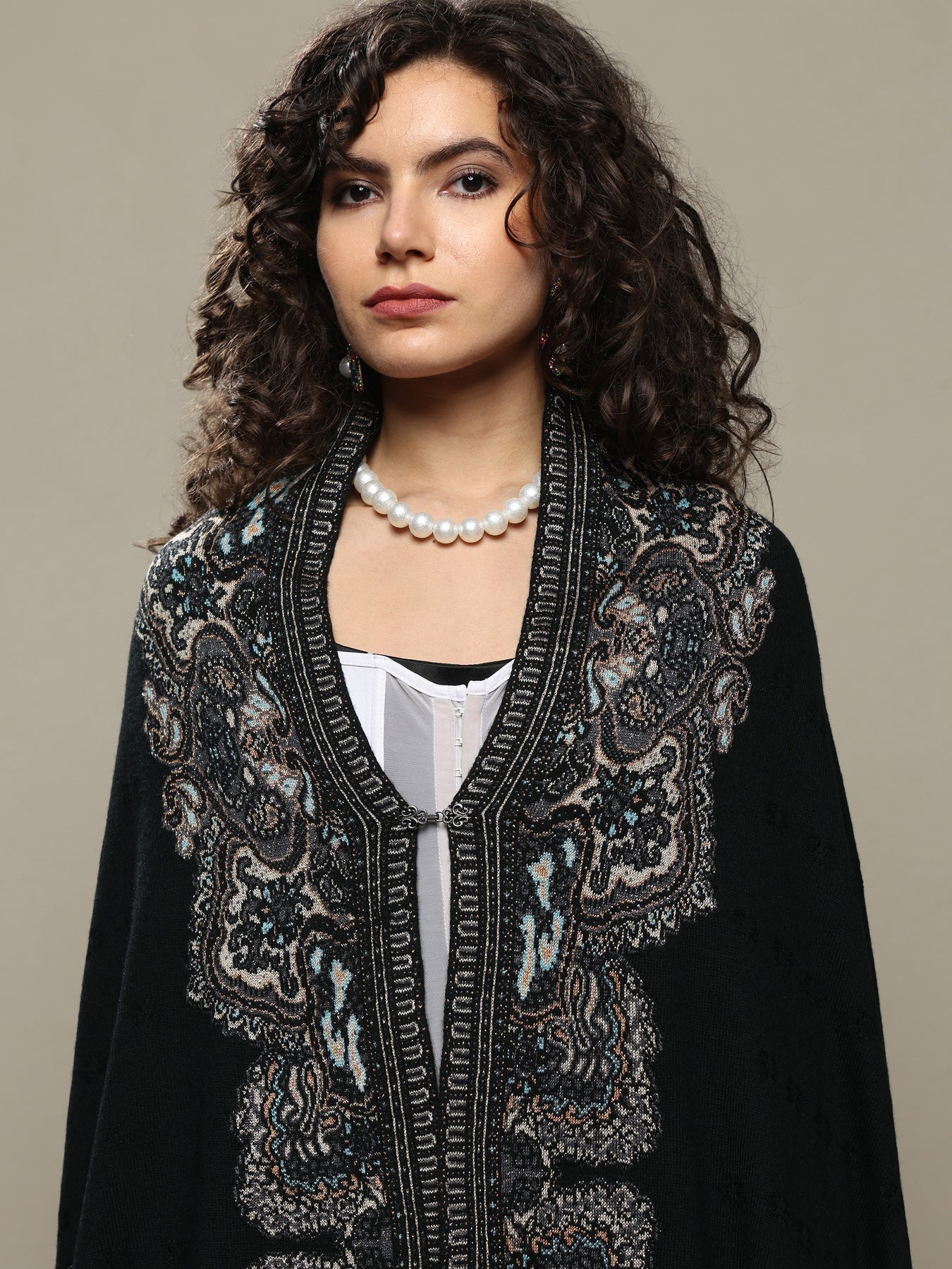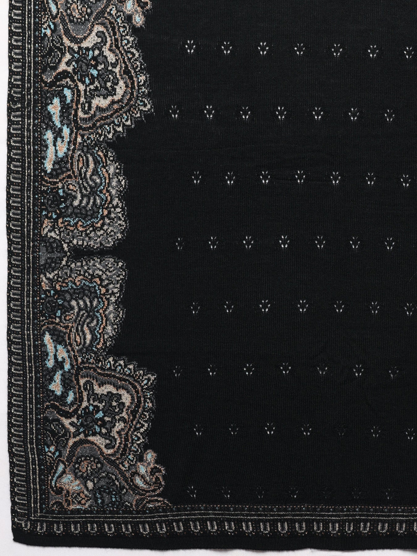 Black woolen shawl featuring intricate embroidered patterns inspired by traditional motifs. Designed to keep you warm and stylish, this versatile wrap pairs effortlessly with your winter ethnic look or drape it with your festive saree for special occasions. Tailored with detailed border embellishments, this shawl ensures both comfort and elegance in every drape. The shawl also includes a soft-drape finish for enhanced usability.