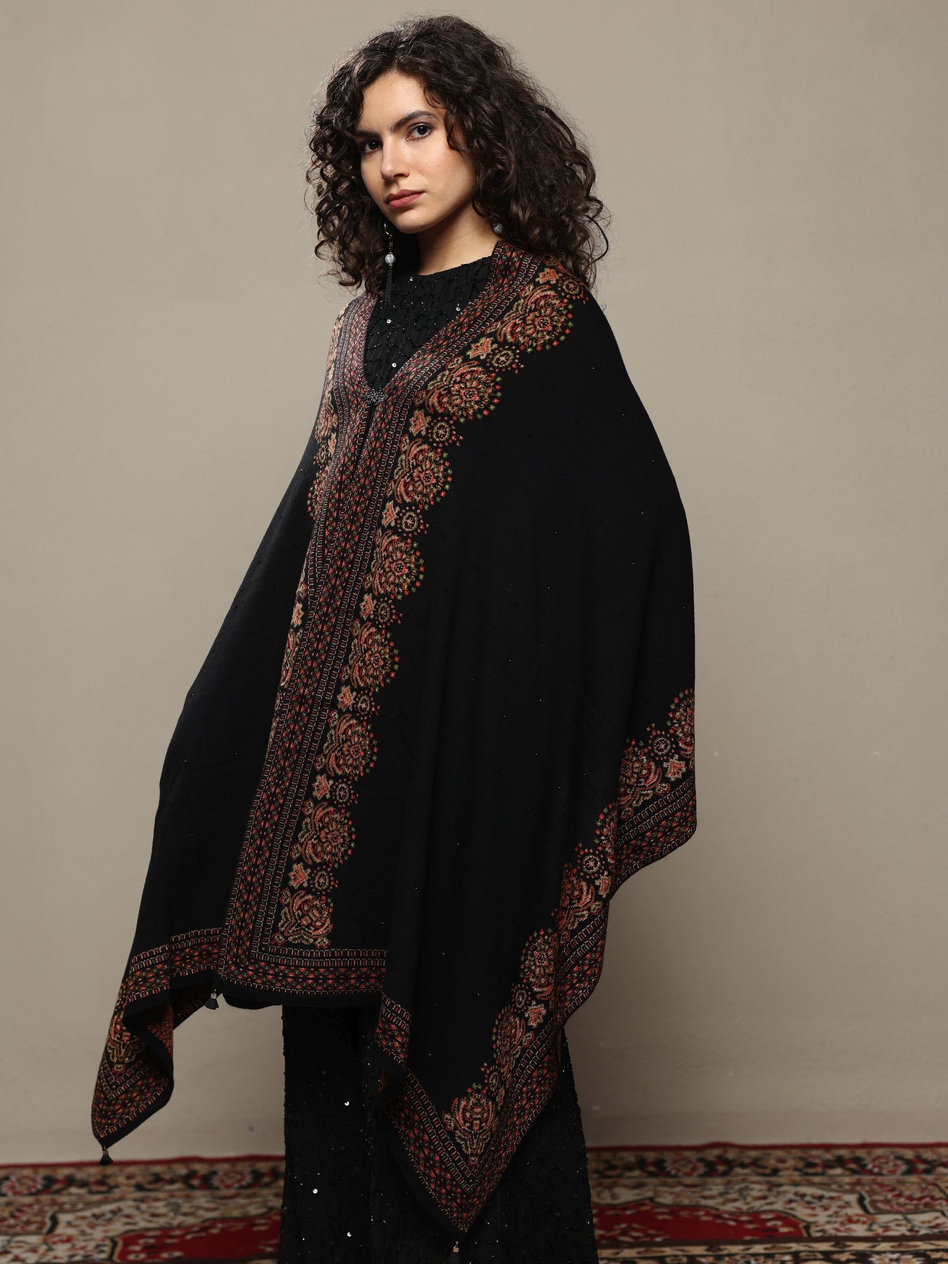 Black woolen shawl featuring intricate embroidered patterns inspired by traditional heritage motifs. Designed to keep you warm and stylish, this versatile wrap pairs effortlessly with your winter ethnic look or drape it with your festive saree for special occasions. Tailored with detailed embroidered borders, this shawl ensures both comfort and elegance in every drape. The shawl also includes a soft-drape finish for enhanced usability.