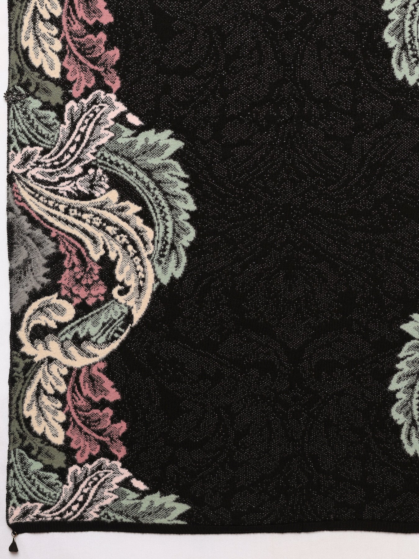 Black woolen shawl featuring intricate embroidered patterns inspired by traditional motifs. Designed to keep you warm and stylish, this versatile wrap pairs effortlessly with your winter ethnic look or drape it with your festive saree for special occasions. Tailored with elegant detailing, the shawl includes a tassel finish for enhanced usability and charm.