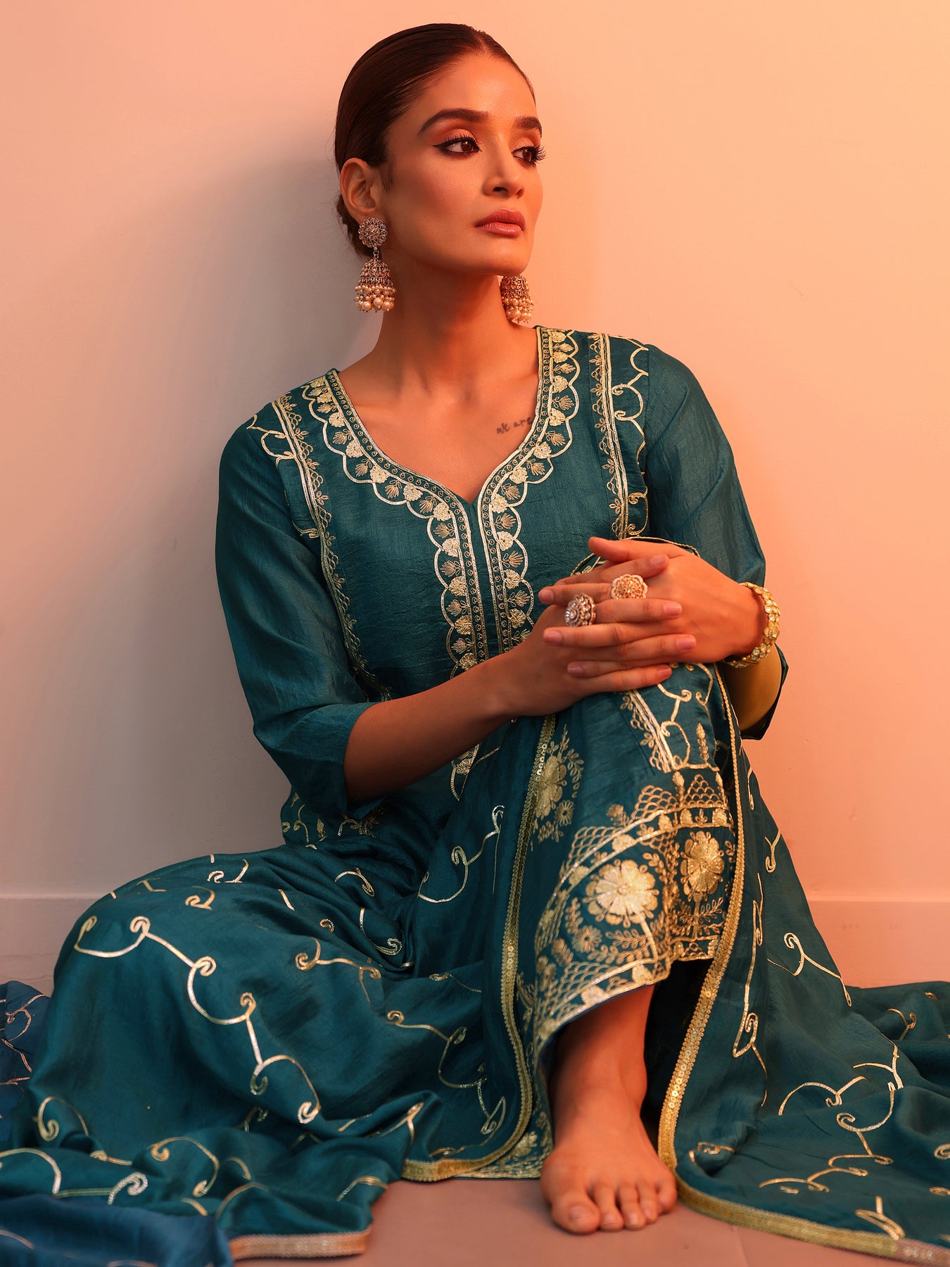Pair this embroidered kurta with gold jewellery, a clutch bag, and embellished juttis for an elegant festive look.