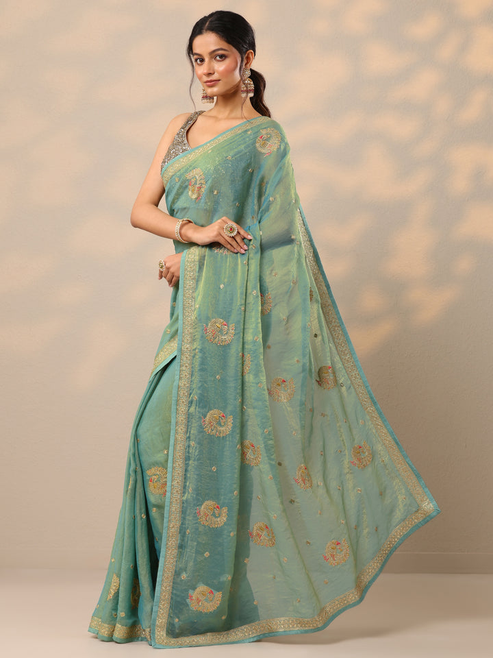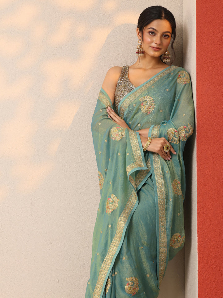 Blue Embroidered Organza Sarees With Unstitched Blouse Piece