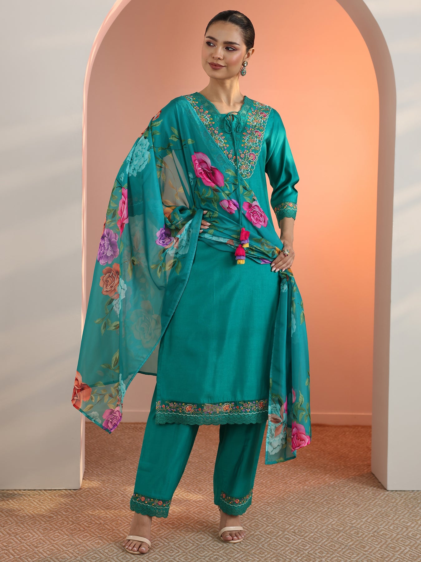 Our 3-piece teal silk blend kurta set features a straight-fit kurta with a round neckline, regular sleeves, and a statement yoke. Complemented with straight pants with a partially elasticated waistband and 2 pockets, and a printed dupatta. Adorned with floral embroidery, this style is perfect for semi festive wear.