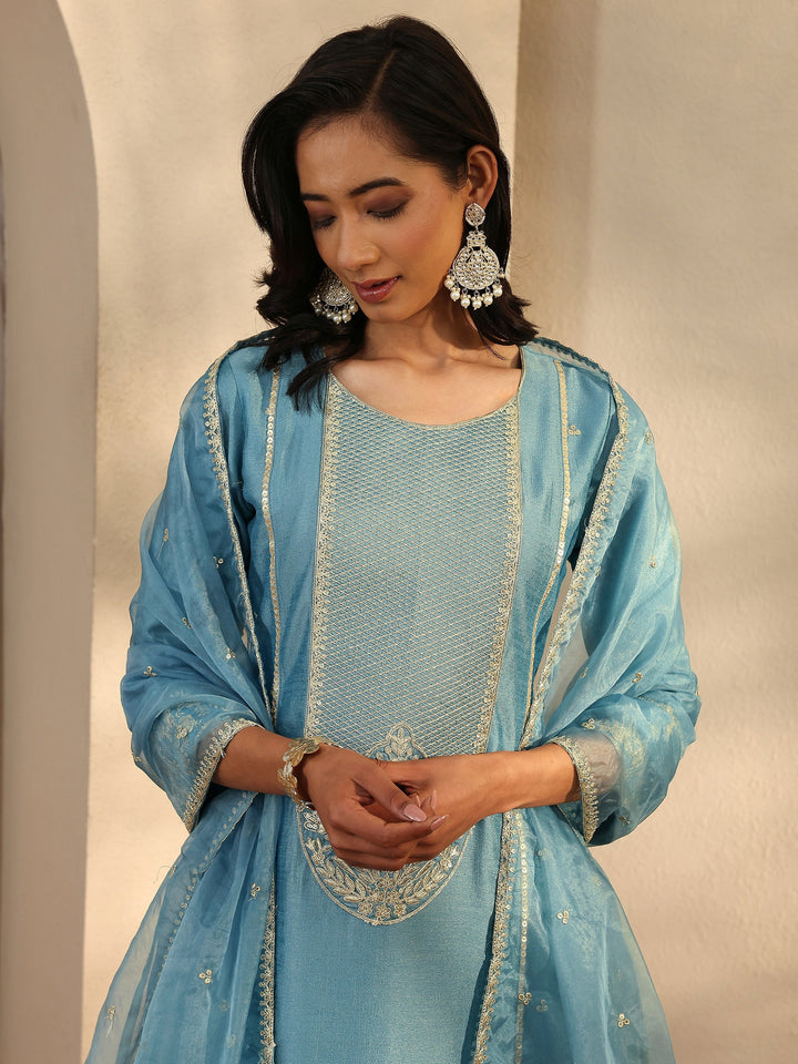 Blue Embroidered Silk Blend Straight Suit Set With Dupatta