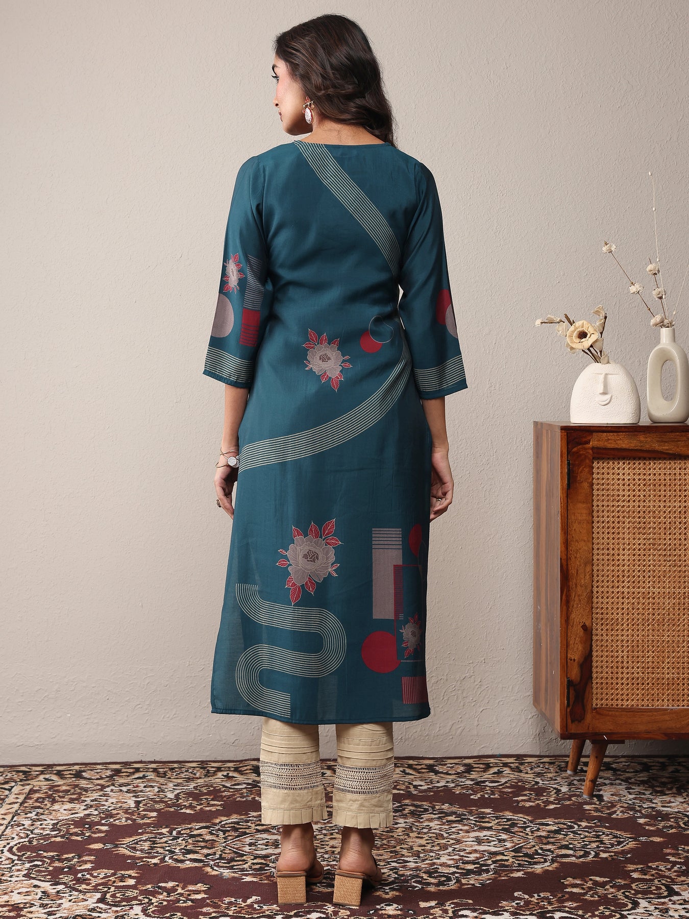 Our 1-piece teal silk blend straight-fit kurta features a V-neckline, regular sleeves, and statement Yoke. Adorned with floral motif print, this style is perfect for work wear and casual wear.