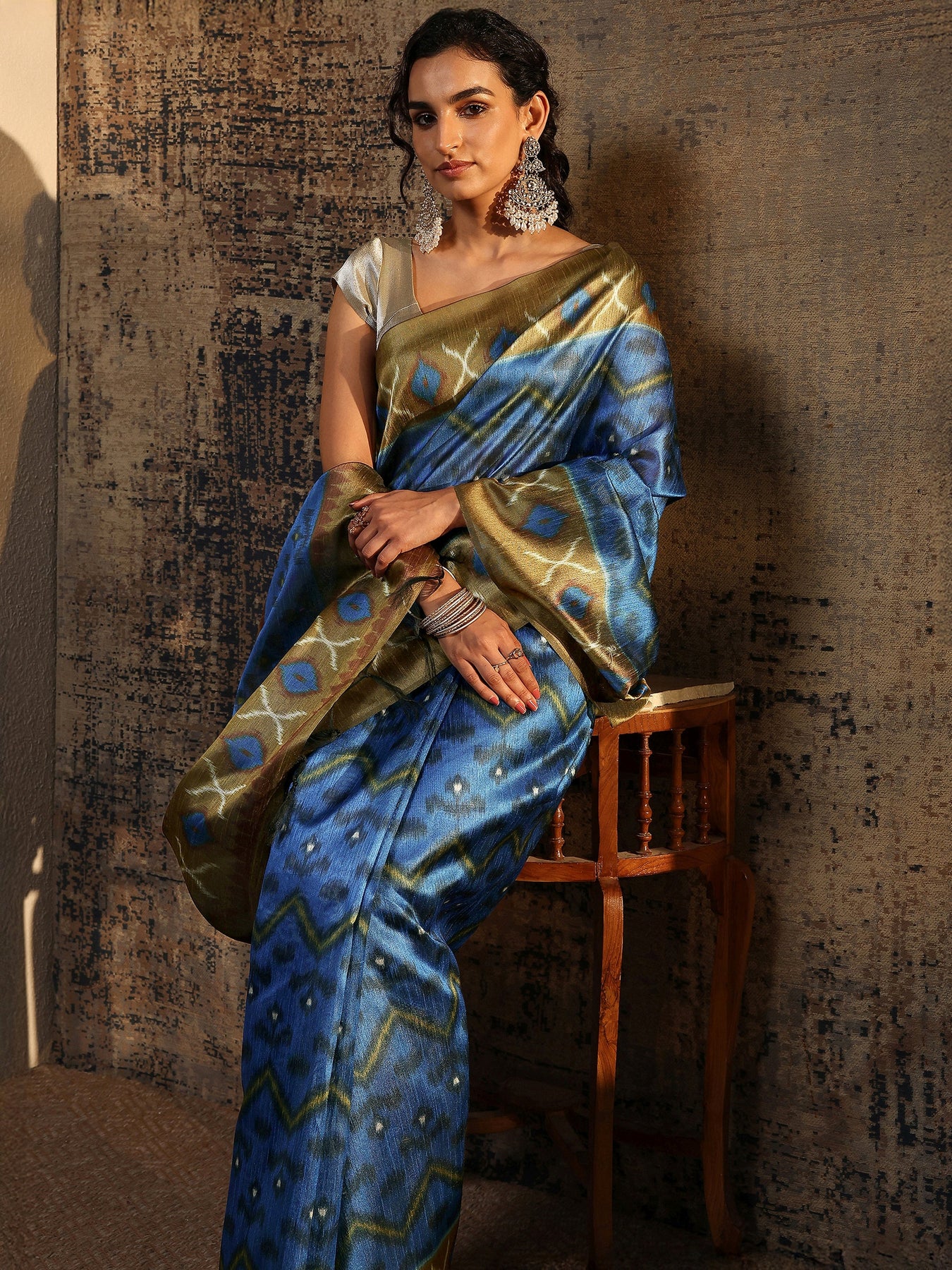 Blue Ikat Printed Silk Saree With Unstitched Blouse Piece