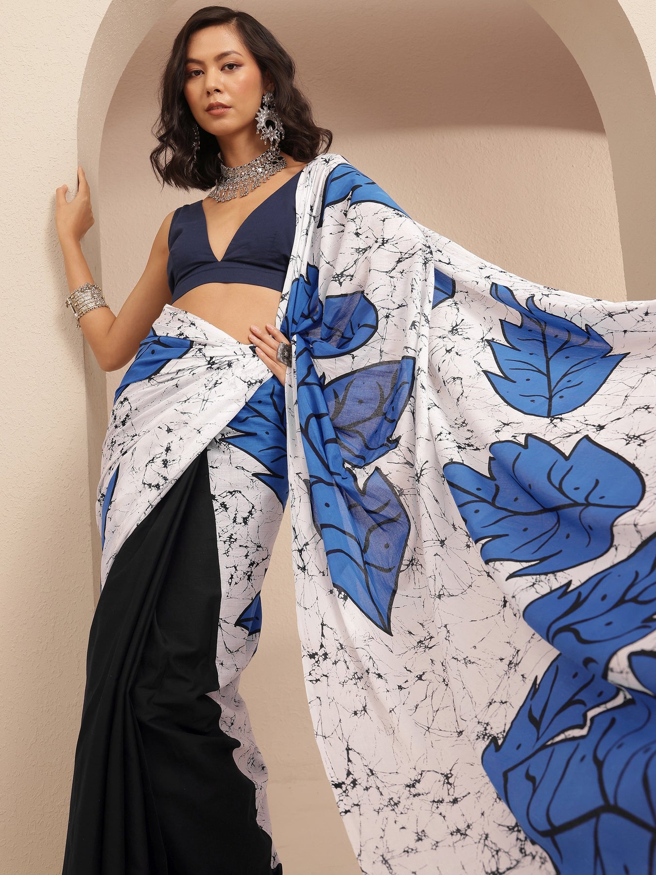 Our blue printed cotton saree features captivating leaf print. Complemented with an unstitched Blouse Piece. This charming saree is perfect for festive occasions