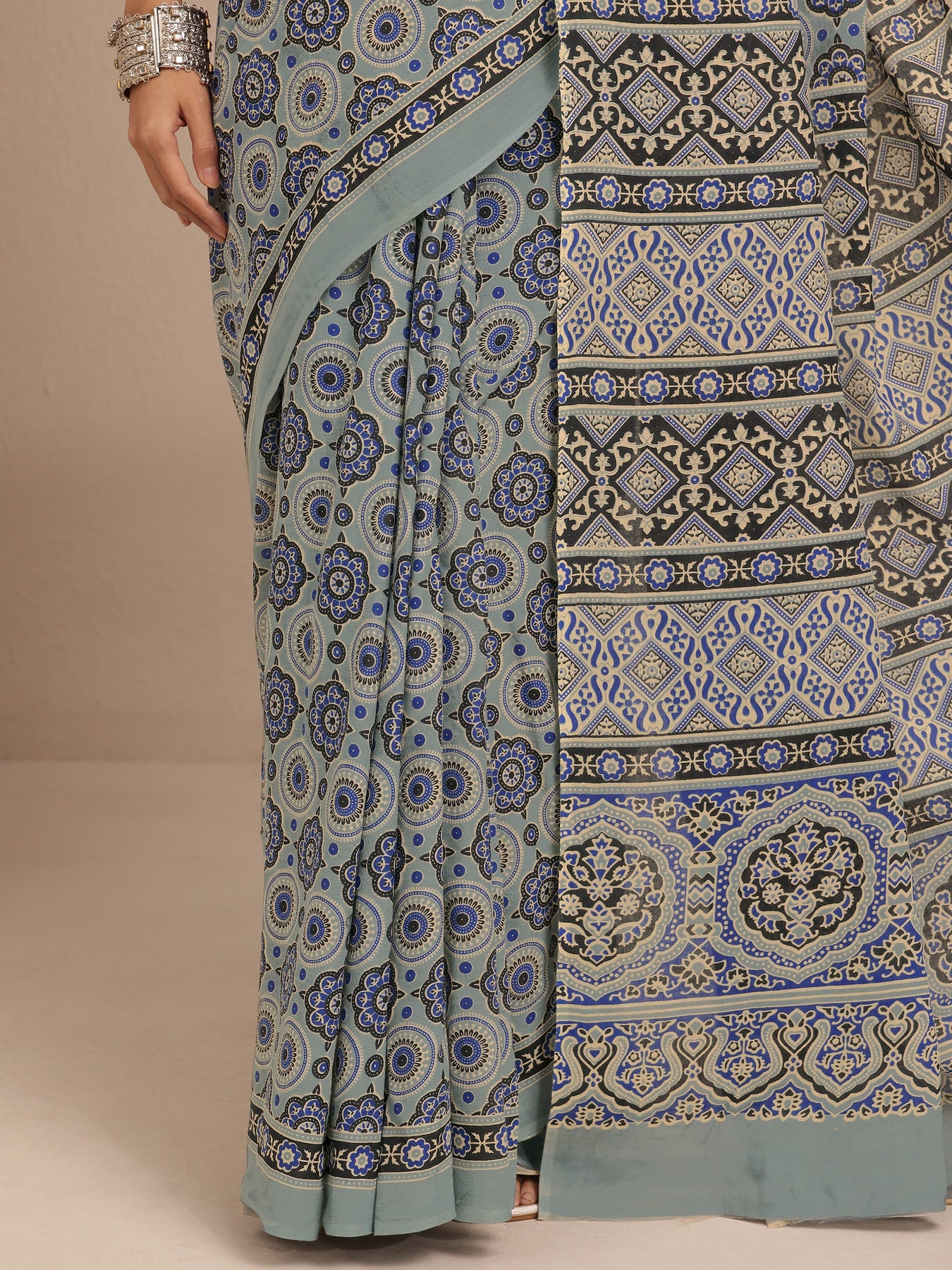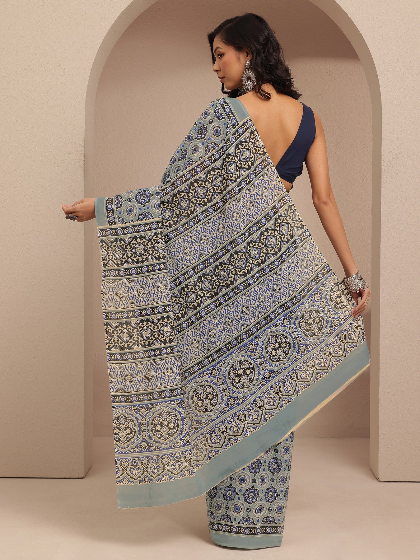Our blue printed cotton saree features captivating geometric print. Complemented with an unstitched Blouse Piece. This charming saree is perfect for festive occasions