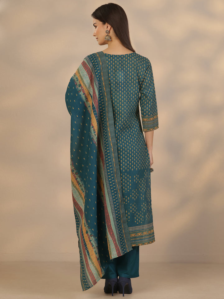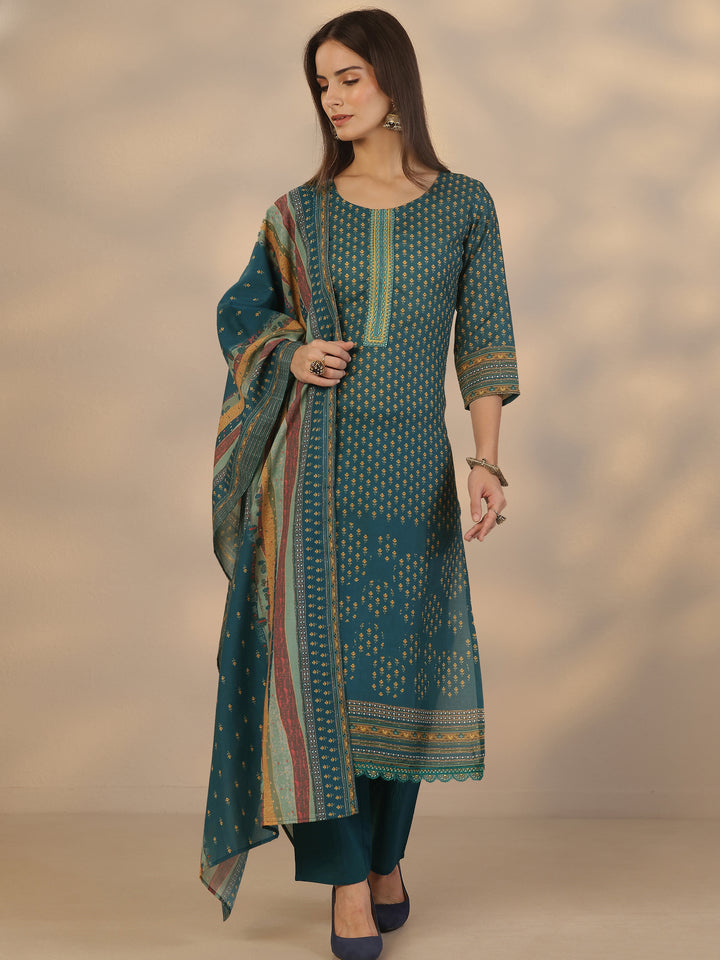 Blue Printed Cotton Straight Suit Set With Dupatta