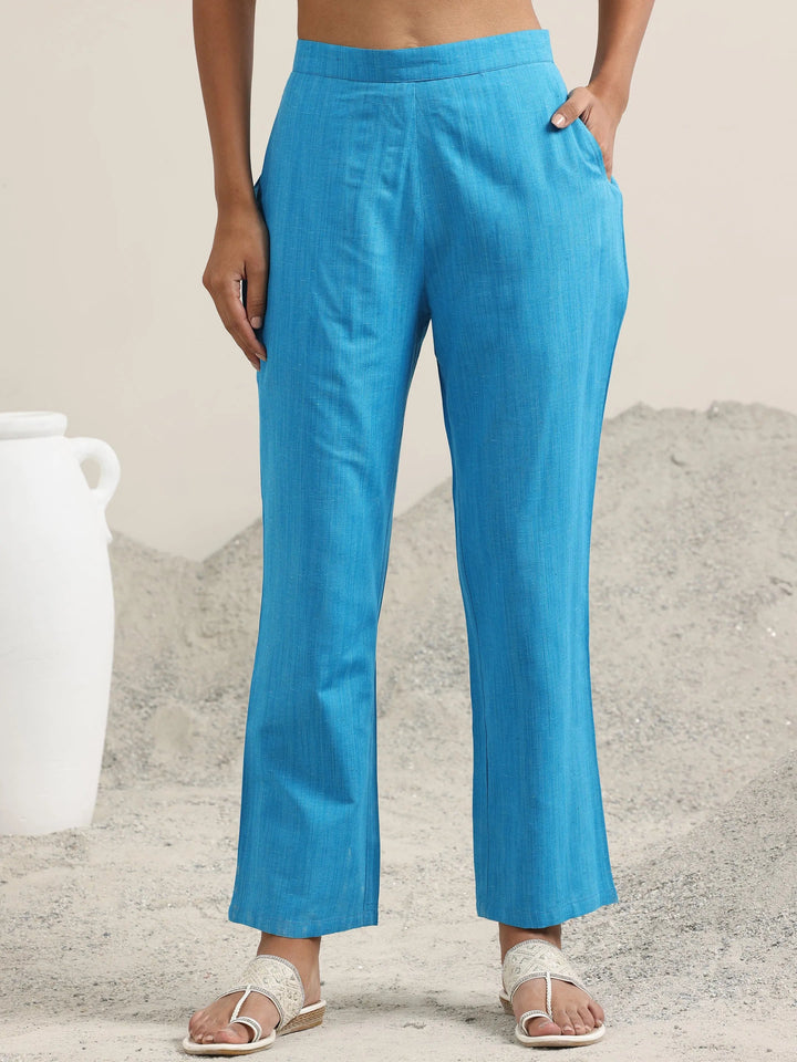 Our 3-piece blue printed cotton blend straight suit set features a straight-fit kurta with a classic V-neckline and three-quarter sleeves. Complemented with matching trousers with a partially elasticated waistband, roomy pockets, and a printed dupatta. Adorned with ethnic motifs prints, and thread-work accents, this style is ideal for elevated everyday wear.