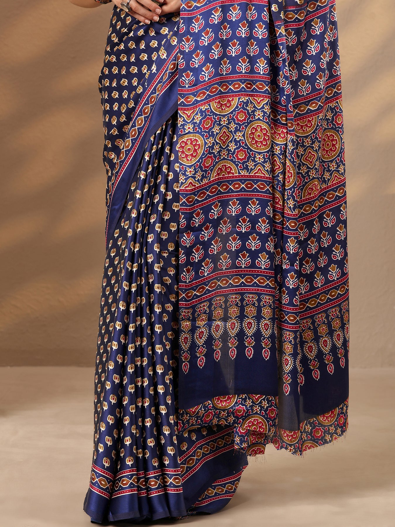 Blue Printed Satin Saree With Unstitched Blouse Piece