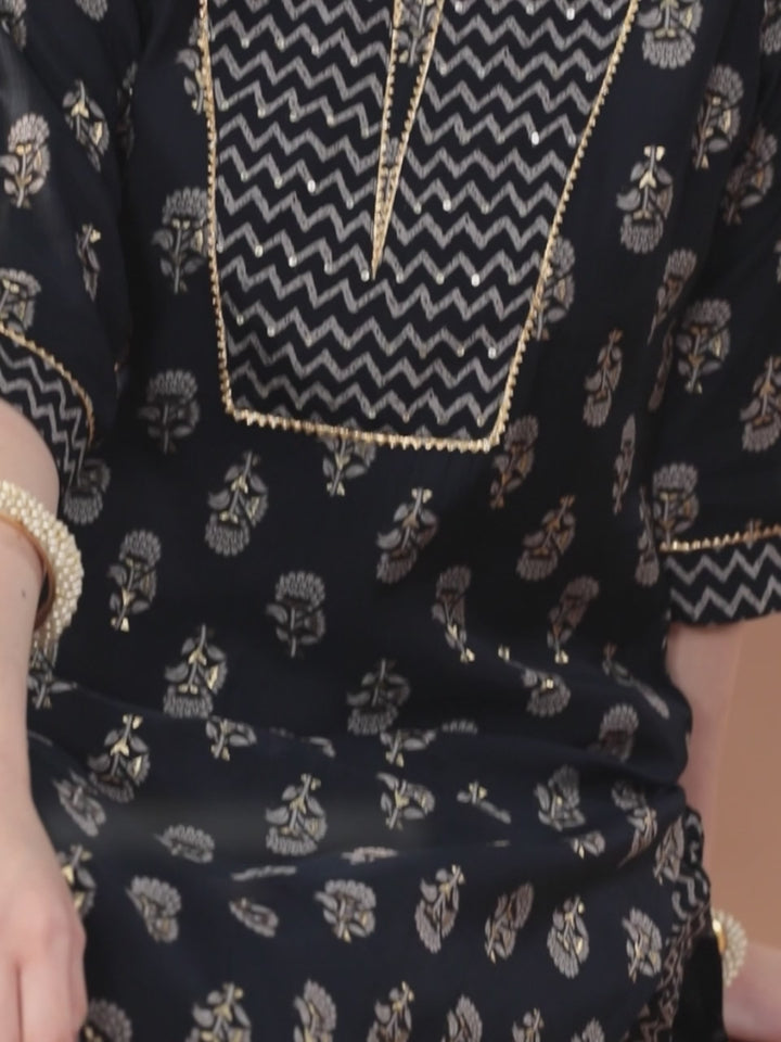 Our 2-piece blue printed kurta set, crafted in silk blend fabric, features a straight-fit kurta with a notched neckline, three-quarter sleeves, and a statement yoke. Complemented with trousers with a partially elasticated waistband and roomy pockets. Adorned with Gota Patti accents and fabric-trim detailing, this style is perfect for elevated everyday wear.