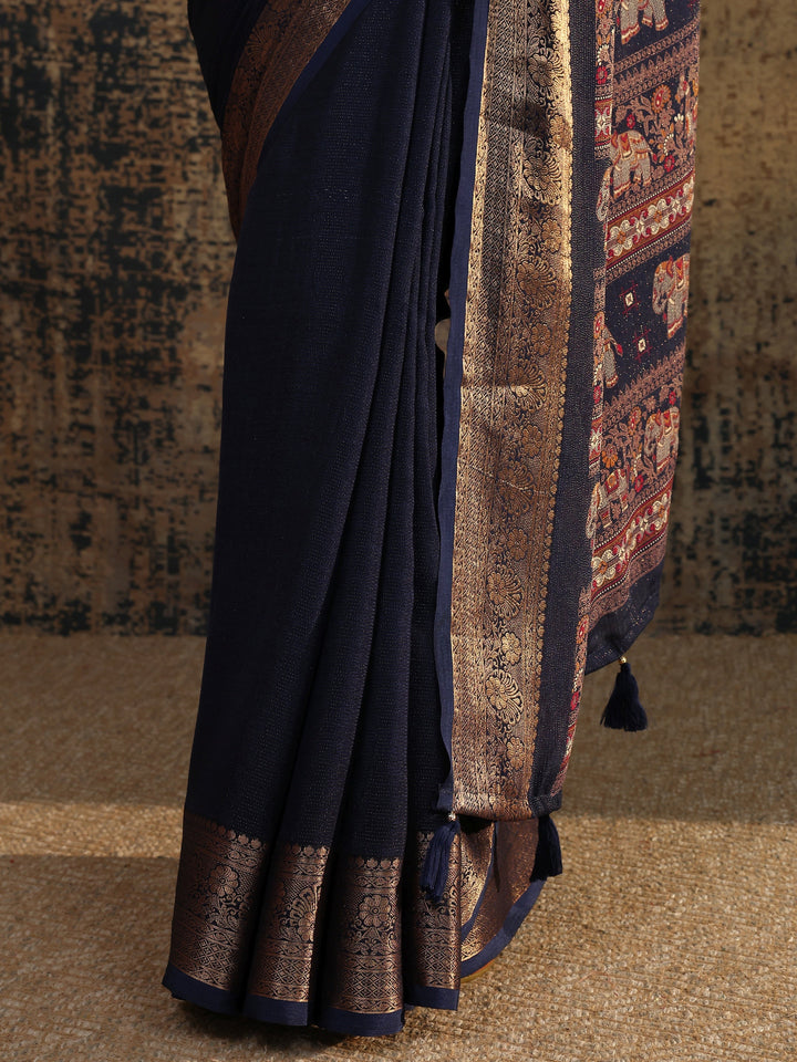 Blue Solid Silk Blend Saree With Unstitched Blouse Piece