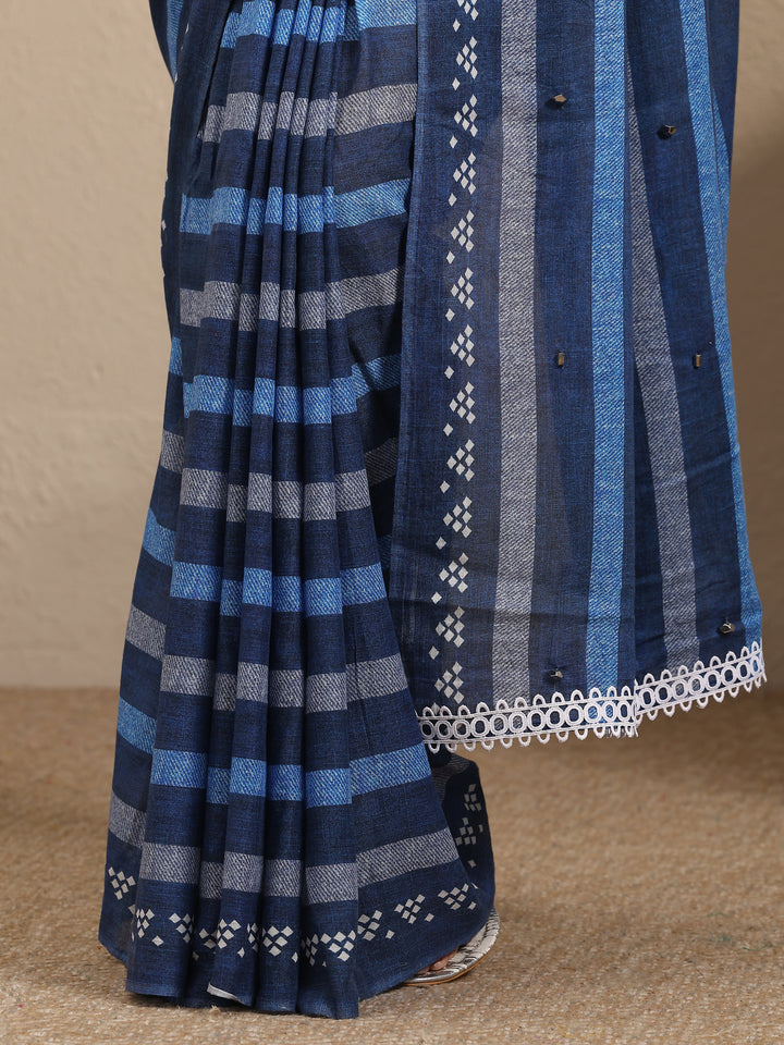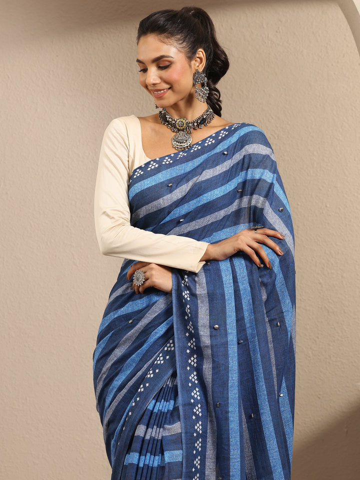 Our Blue Printed Cotton Blend Saree Features Captivating Striped. Complemented With An Unstitched Blouse Piece. This Charming Saree Is Perfect For Festive Occasions.