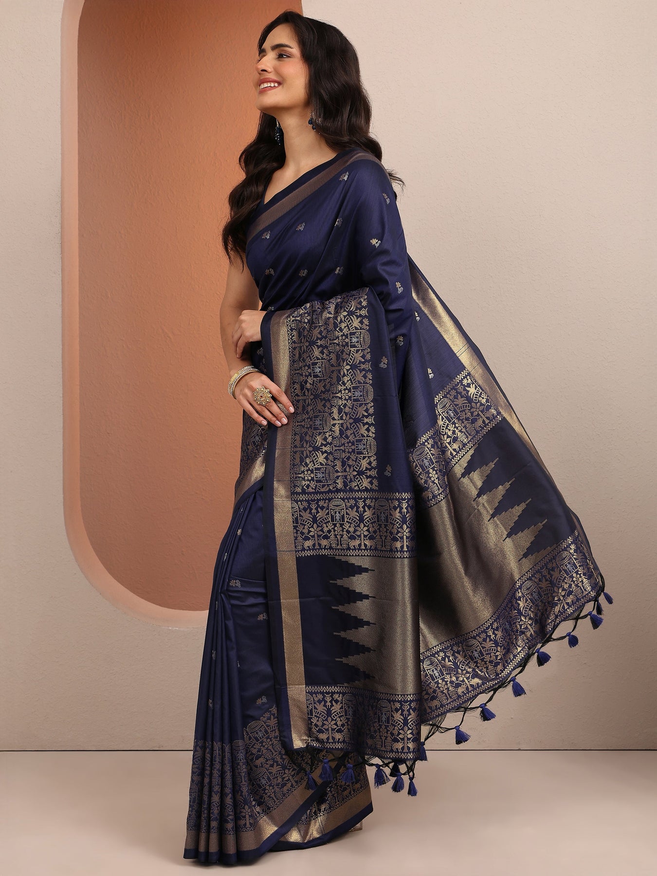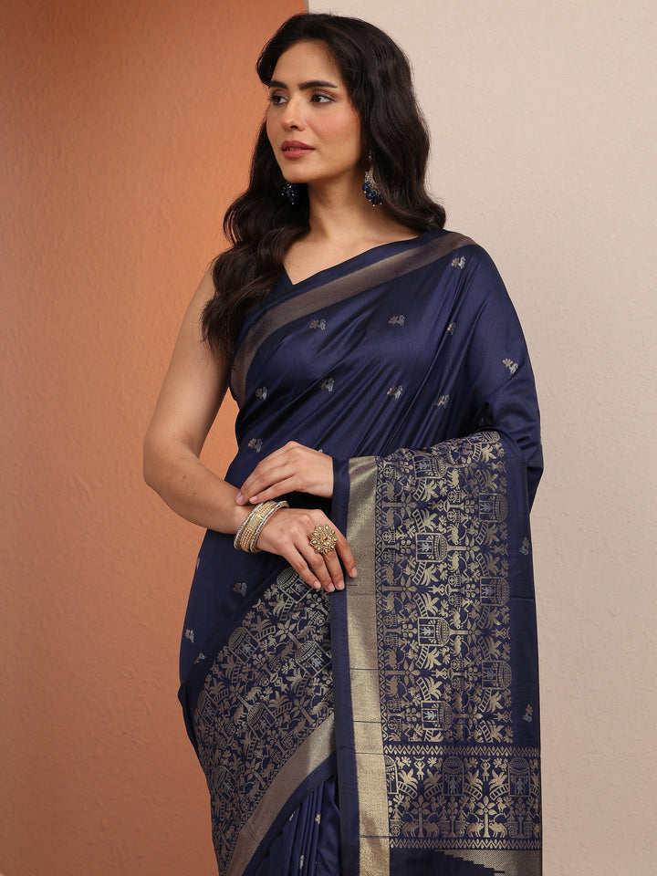 Blue Woven Design Banarsi Silk Blend Saree With Unstitched Blouse Piece