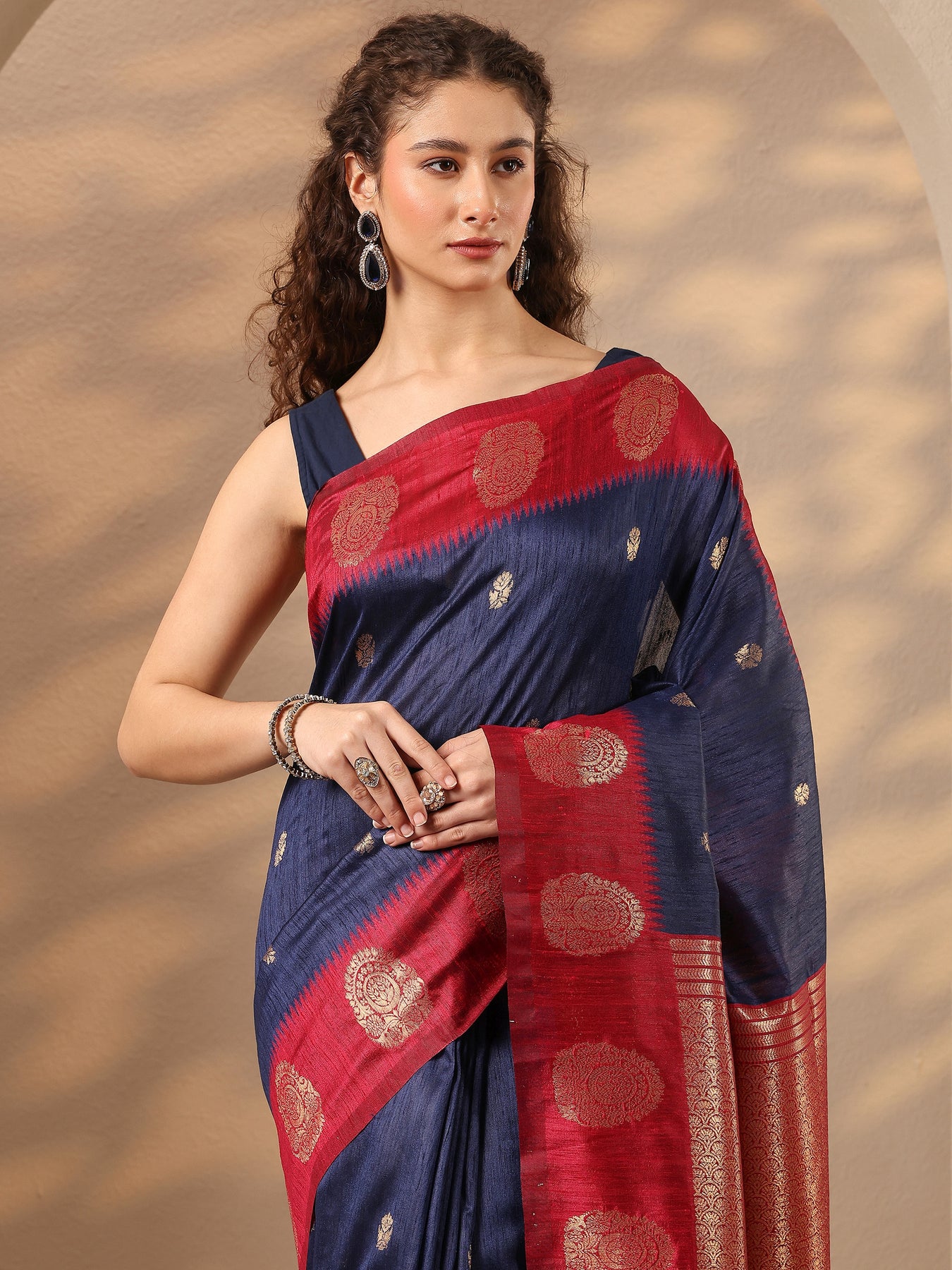 Our Blue Woven Design Silk Blend Saree Features Captivating Ethnic Motif. Complemented With An Unstitched Blouse Piece. This Charming Saree Is Perfect For Festive Occasions.