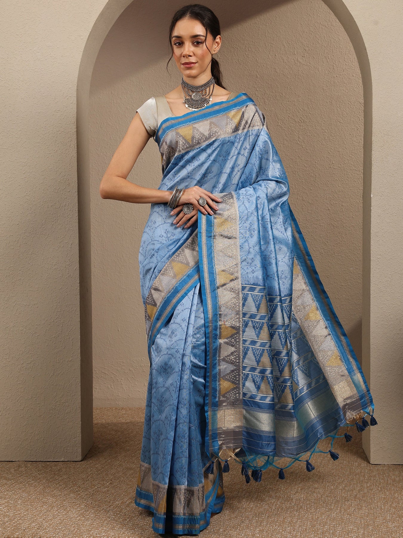 Our blue printed silk blend saree features captivating geometric print. Complemented with a Unstitched blouse piece.. This charming saree is perfect for festive occasions.