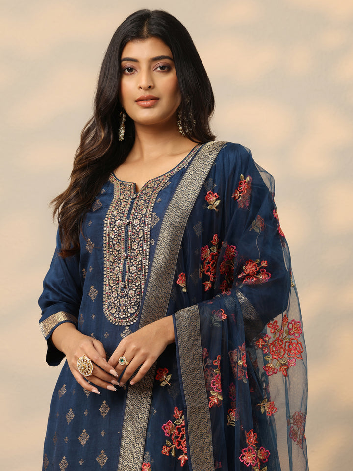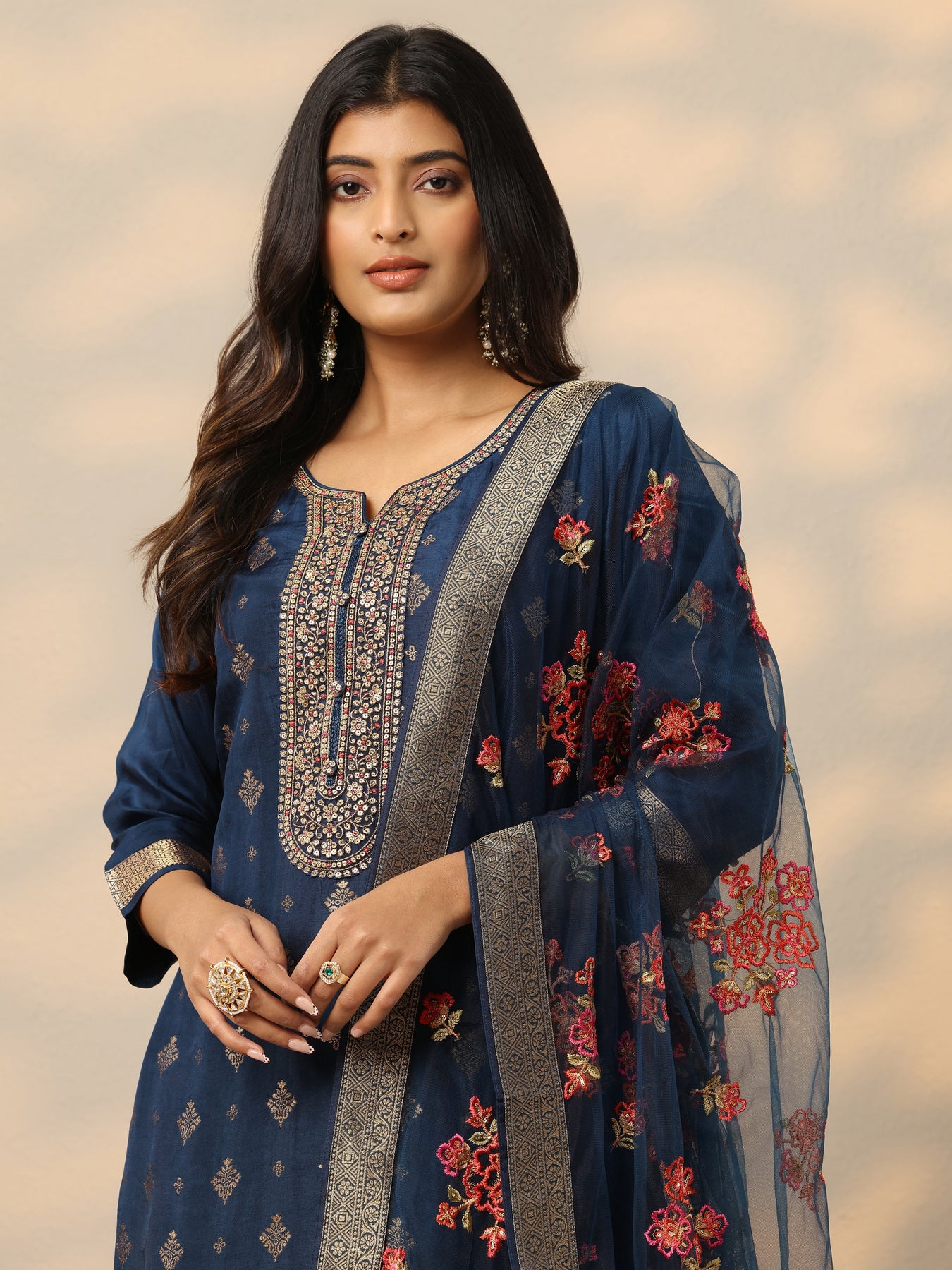 Blue Woven Design Silk Blend Straight Suit Set With Dupatta
