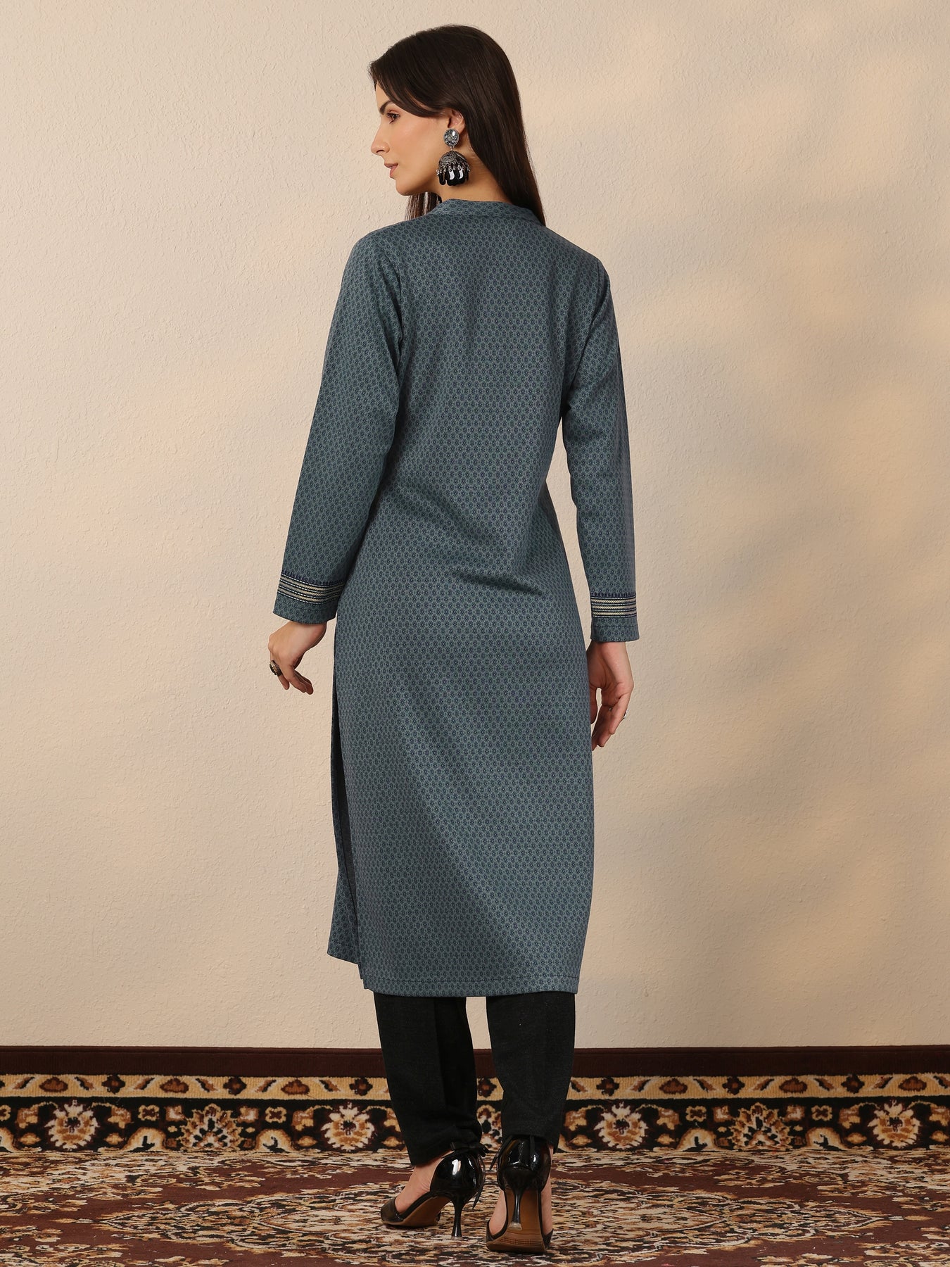 Our 1-piece teal wool straight-fit kurta features a mandarin collar neckline, regular sleeves, and statement Yoke. Adorned with ethnic motif woven design, this style is perfect for work wear and casual wear.