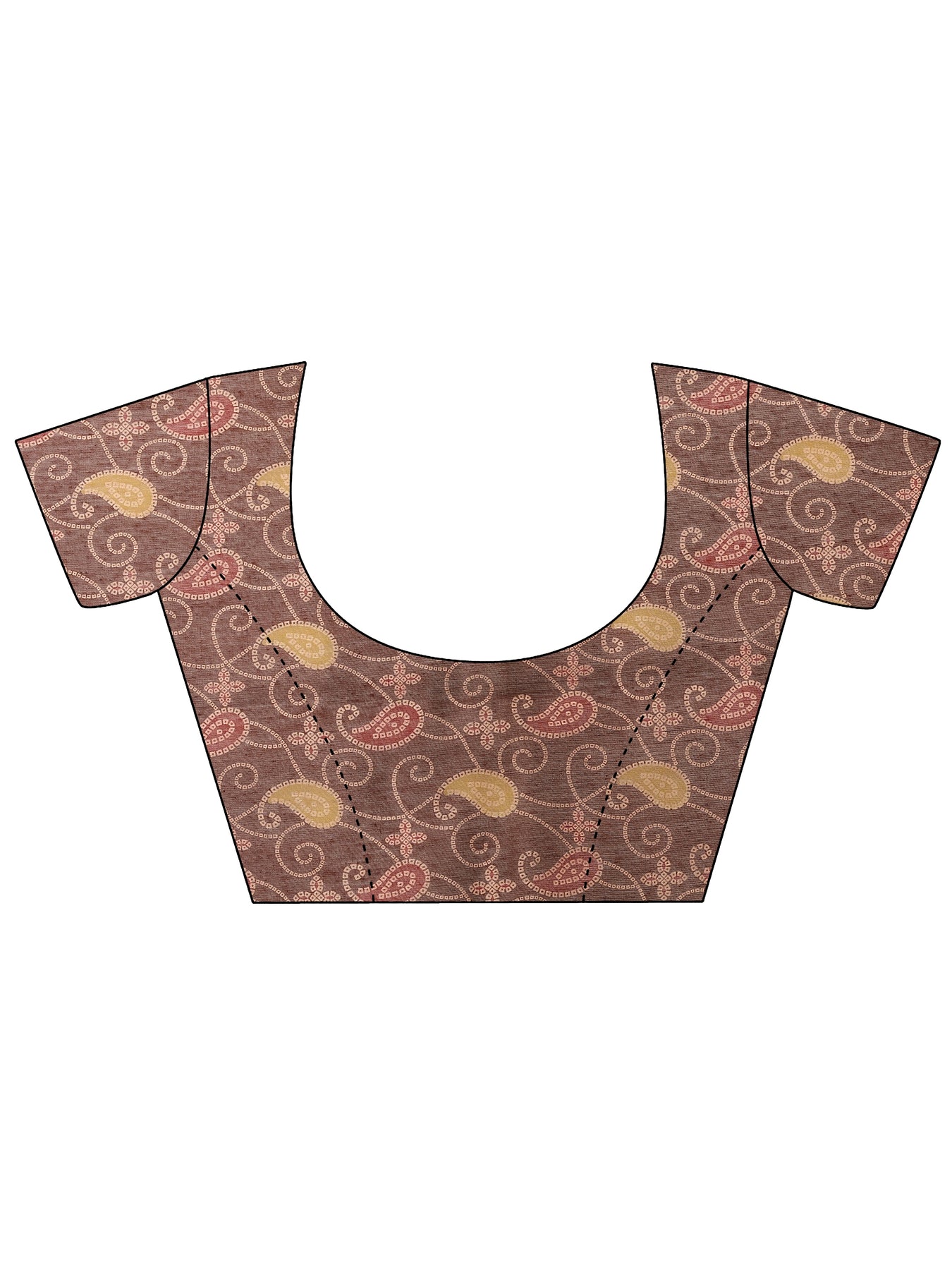 Our Brown Bandhani Printed Silk Blend Saree. Complemented With An Unstitched Blouse Piece. This Charming Saree Is Perfect For Festive Occasions.