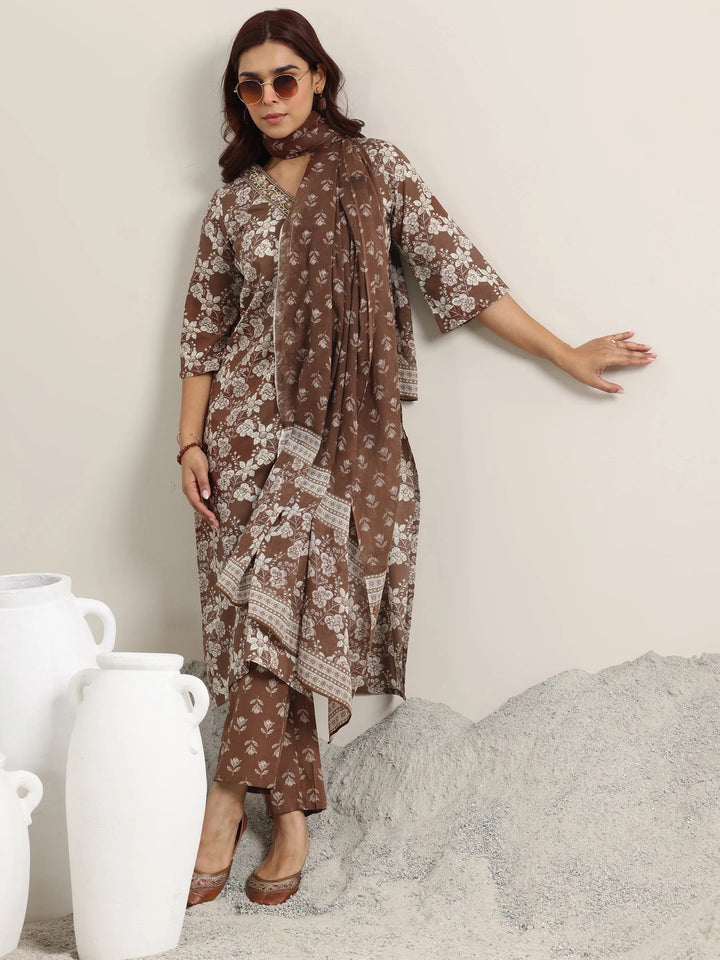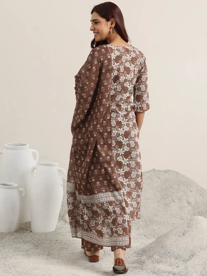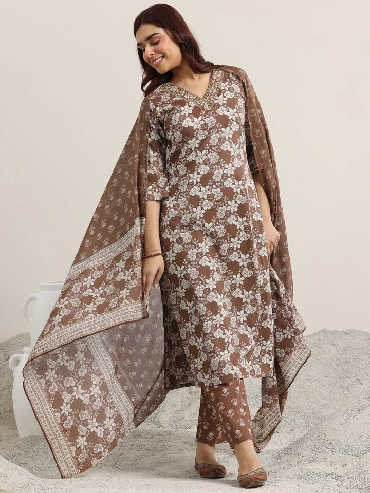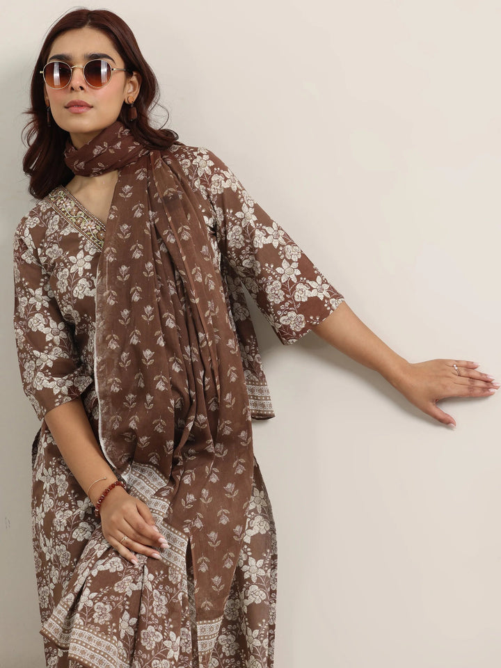 Our 3-piece brown printed cotton straight suit set features a kurta with V-neckline and three-quarter sleeves. Complemented with printed trousers with partially elasticated waistband and roomy pockets, and a printed dupatta. Highlighted with floral prints and thread work, this style is perfect for elevated everyday style.