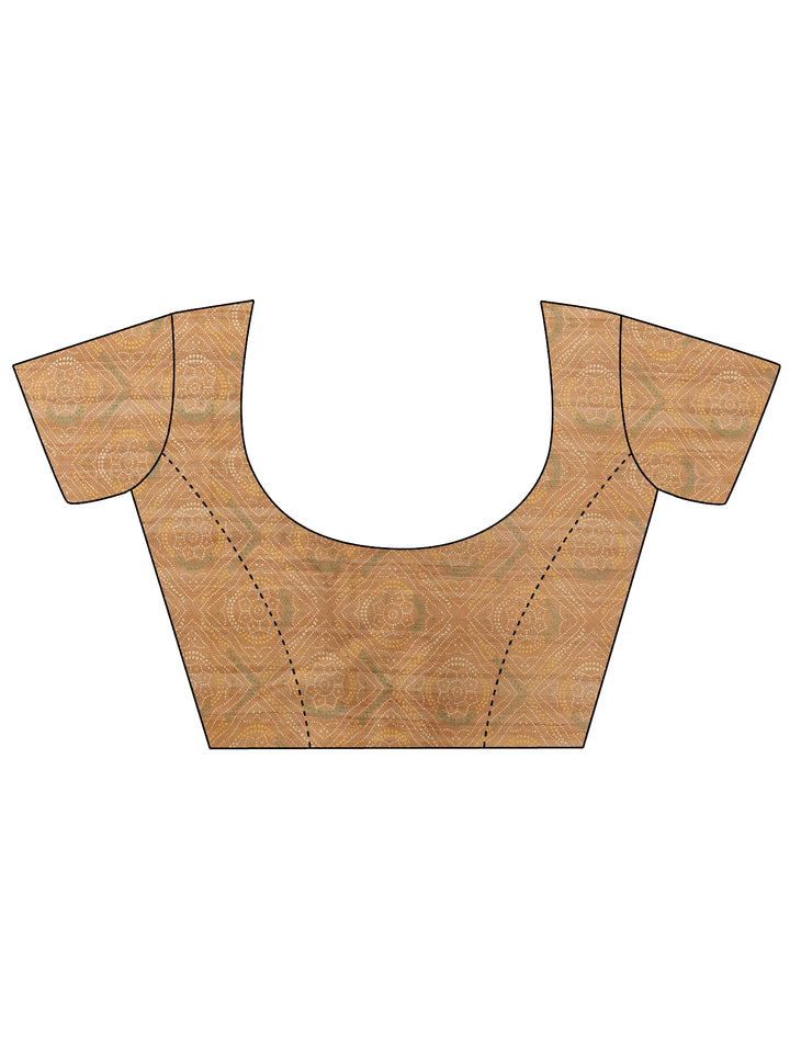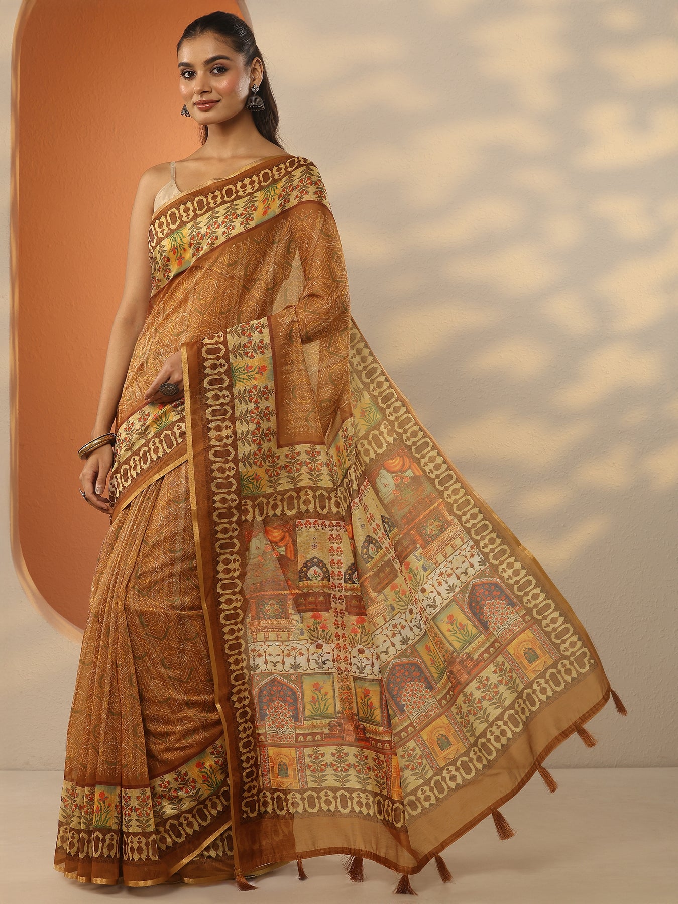 Brown Printed Silk Blend Saree With Unstitched Blouse Piece