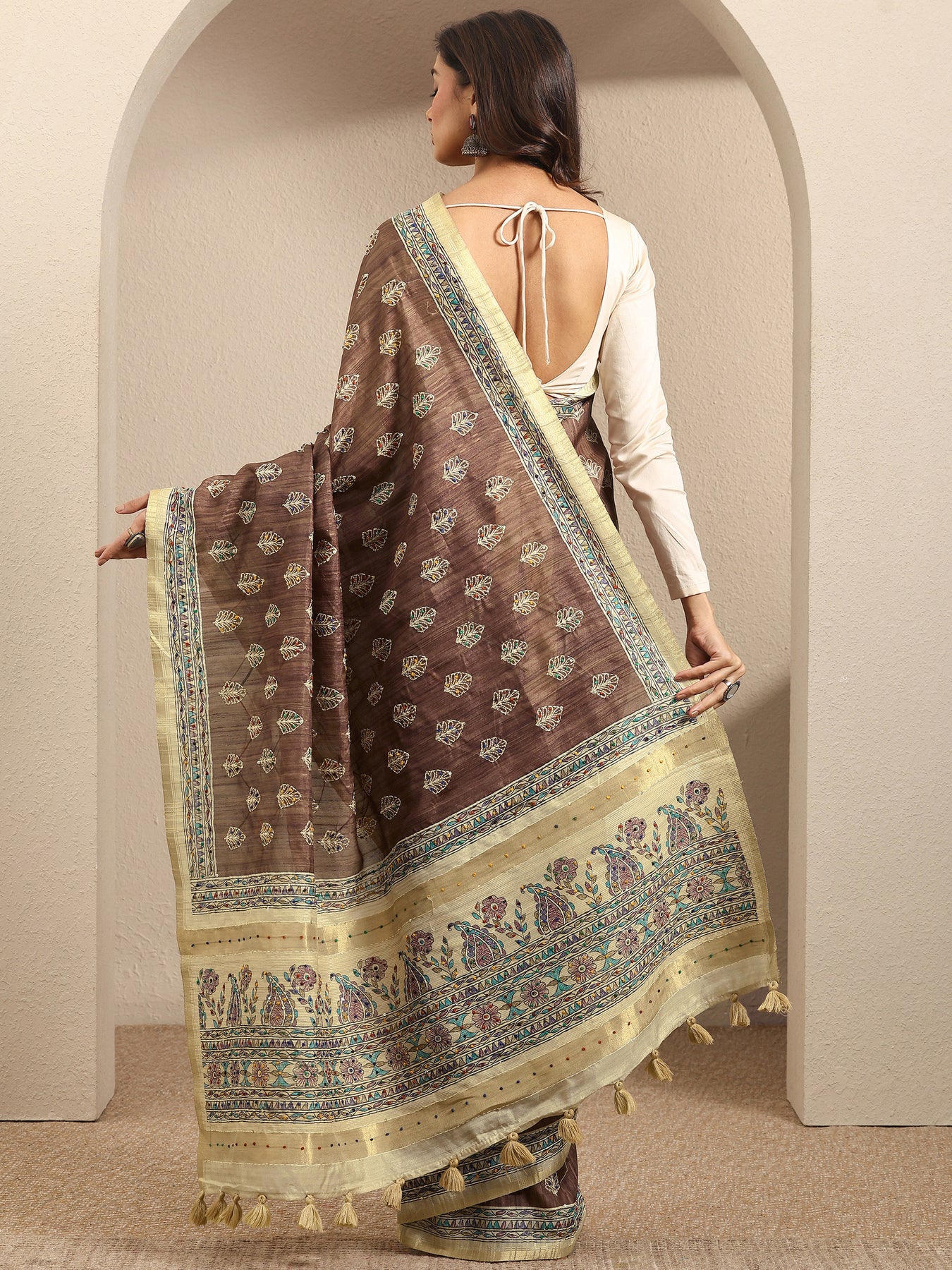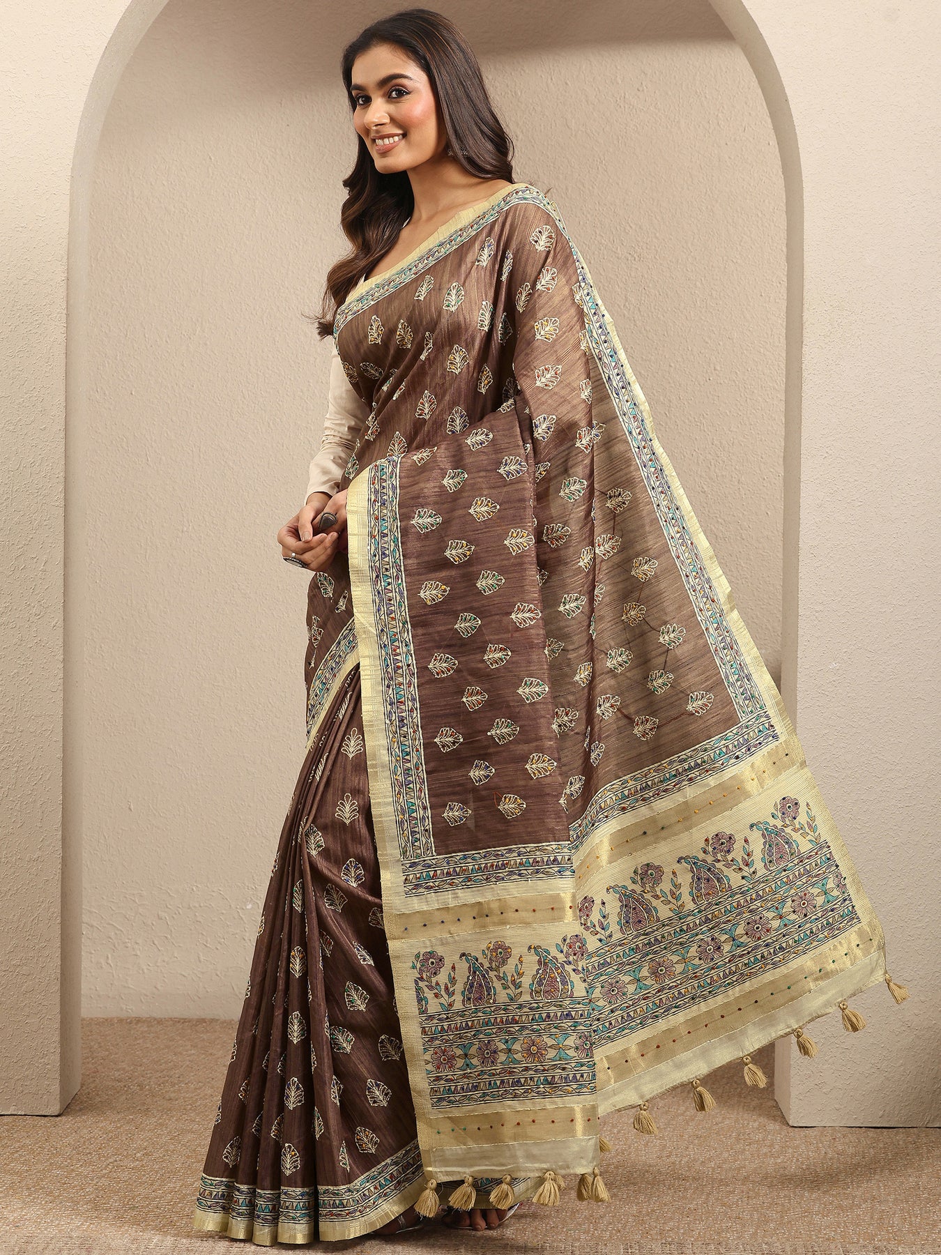 Our Brown Printed Silk Blend Saree Features Captivating Ethnic Motif. Complemented With An Unstitched Blouse Piece. This Charming Saree Is Perfect For Festive Occasions.