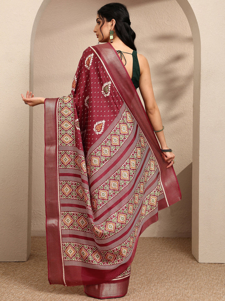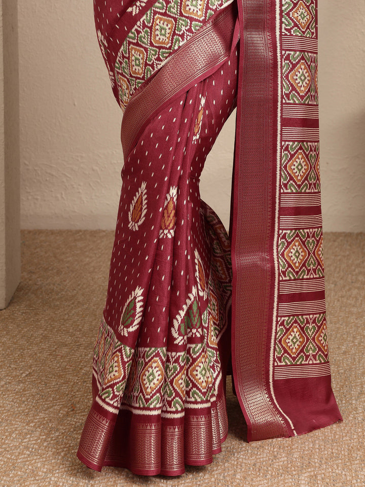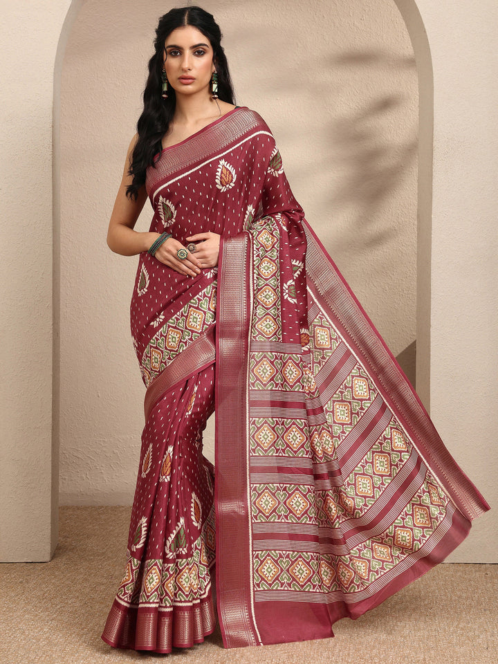 Brown Printed Silk Blend Saree With Unstitched Blouse Piece