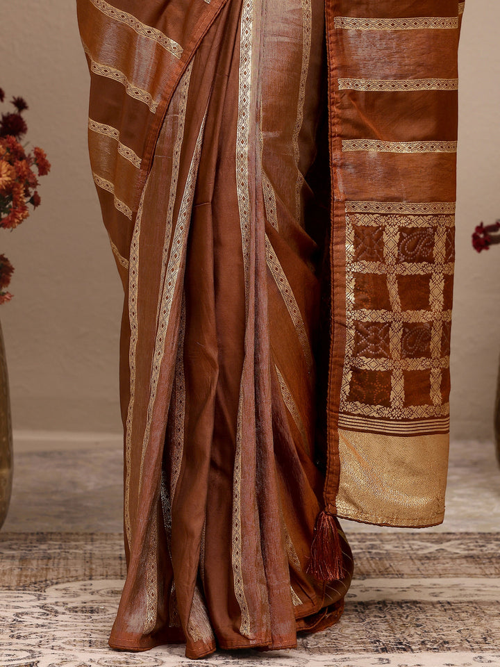 Brown Striped Woven Design Silk Blend Saree With Unstitched Blouse Piece